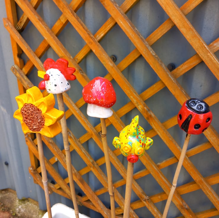 5 Cane Tops for your garden. Made from red earthenware clay, all glazed to suit the subject! Last for years and years in all weathers in your garden. These individuals Red and White Mushroom, Ladybird,. White speckled Chicken, Golden Sunflower, Yellow Speckled Fish. I use a variety of different bamboo canes to give a variety of hole sizes to fit bamboo canes.