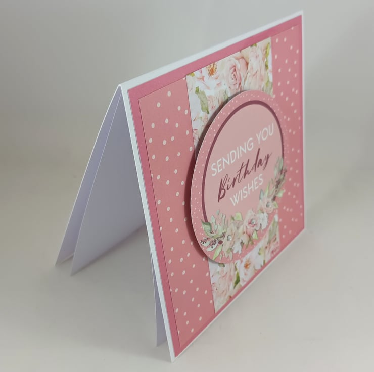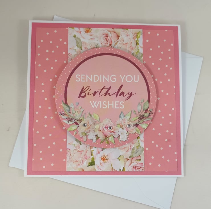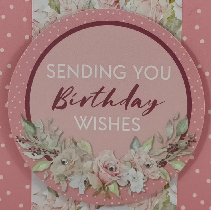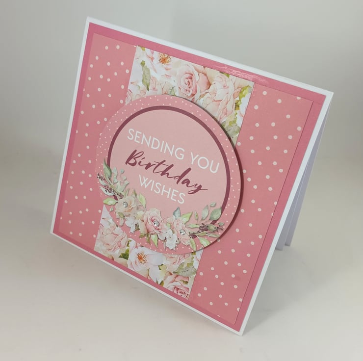 Square, floral birthday card. The card features a circular pink topper with the sentiment 'Sending You Birthday Wishes' above a bough of pink roses with adhesive gems in the centres of the flowers. This is overlaid onto a strip of matching floral paper on a pink polka dot background.