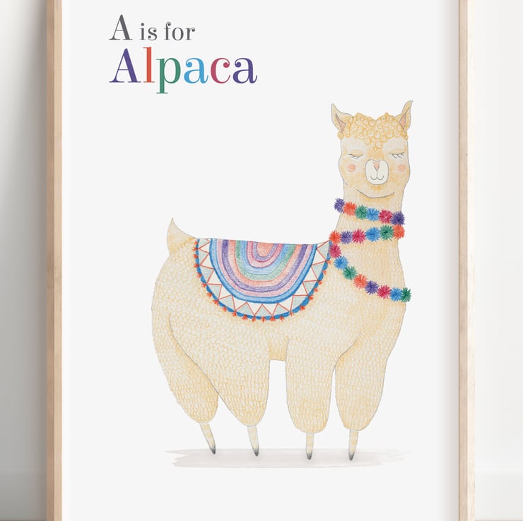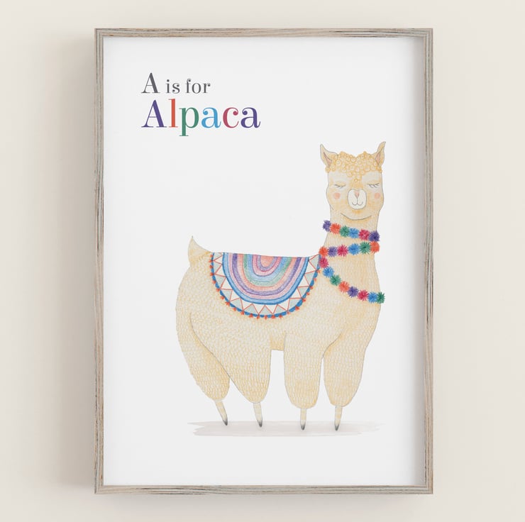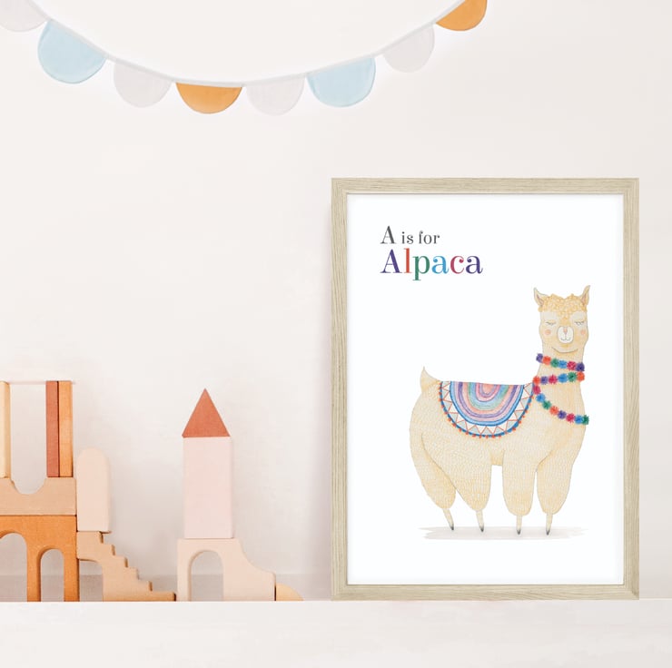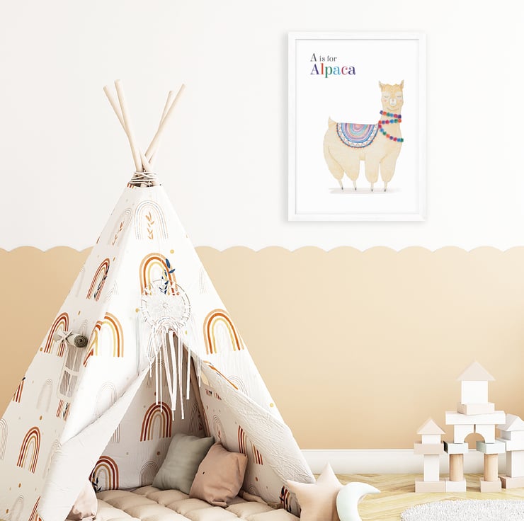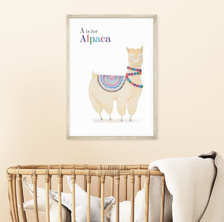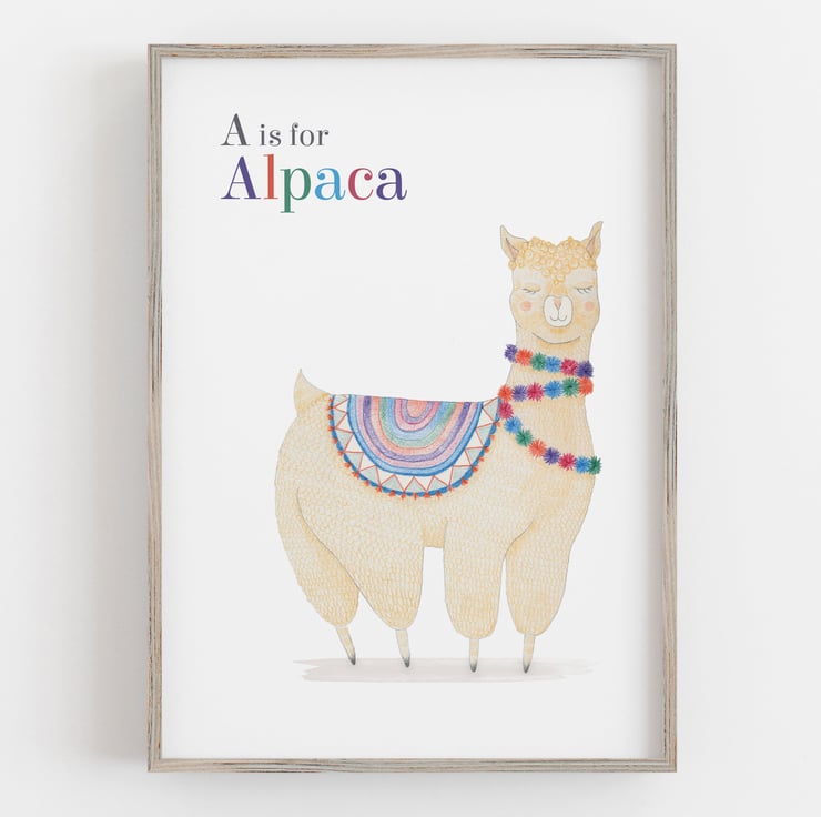 This lovable alpaca art print with colourful pom poms will look at home in a child’s bedroom or playroom. Just perfect for a desert themed nursery!