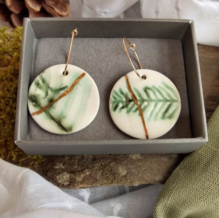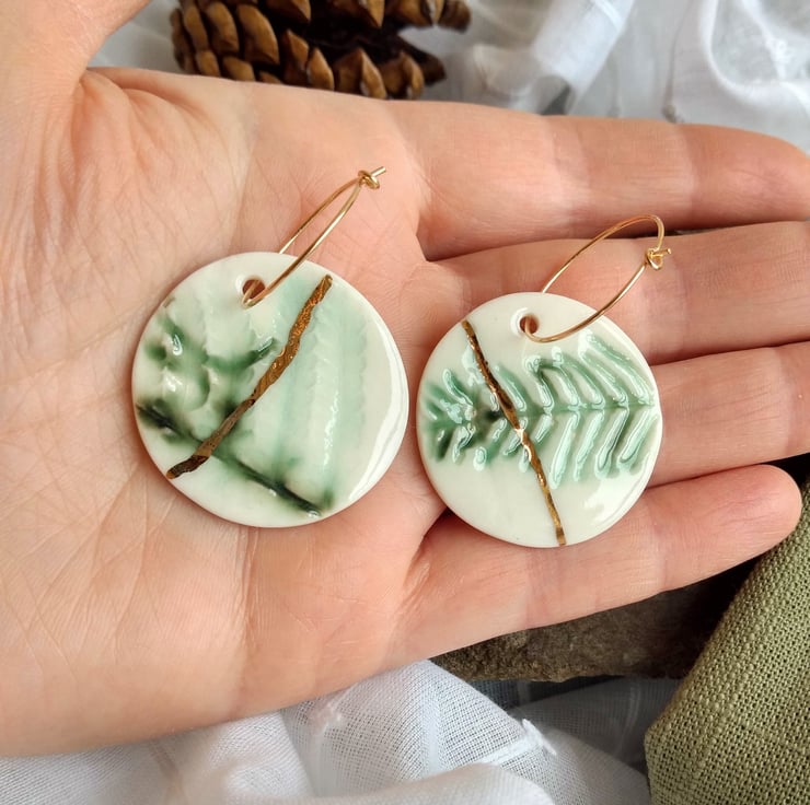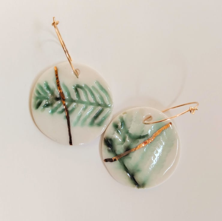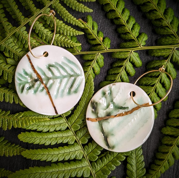Handmade, gold lustre accented fern porcelain charms in Kintsugi style. Charms hang on delicate 20mm gold filled hoops. Each earring is made from an individual fern foraged from the garden making them truly unique.