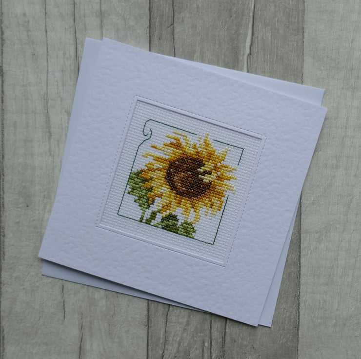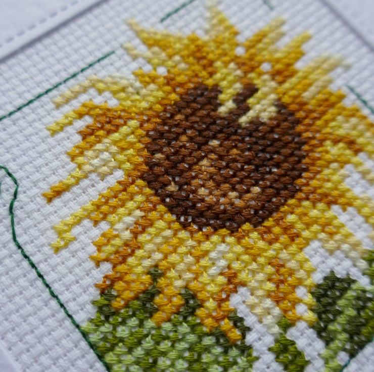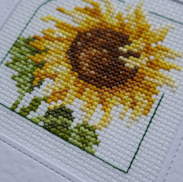 The cross stitch sunflower is from the Carolyn's Garden series by Serendipity Designs. The sunflower has been stitched in shades of yellow and the centre has been stitched in shades of brown. The leaves have been stitched in shades of green. The sunflower is highlighted with a green backstitch border. The cross stitch has been mounted behind a stitched square aperture and a piece of the same card has been attached to the inside to cover the stitching.