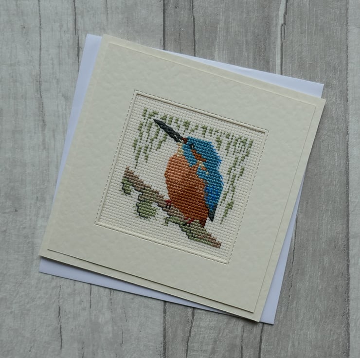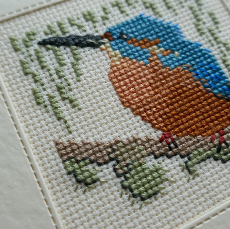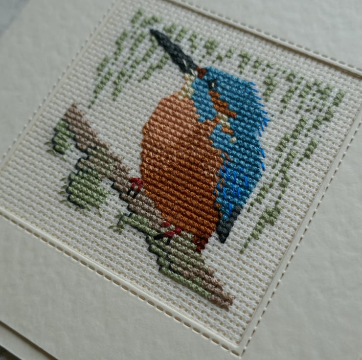 This blank card measures approximately 5" x 5" and is made from cream hammer card. The kingfisher has been stitched in shades of brown and blue and is on a brown branch surrounded by green leaves. The cross stitch has been mounted behind a cream hammer frame that has been cut with a stitched circle die before being attached to the centre of the card.