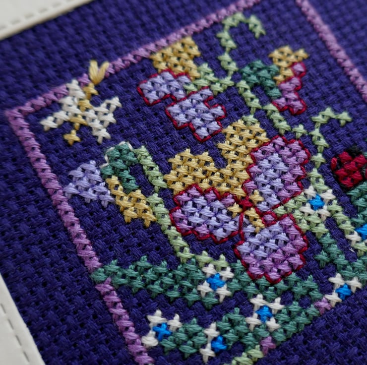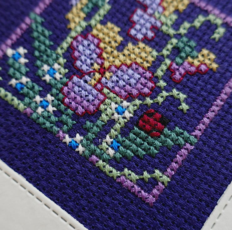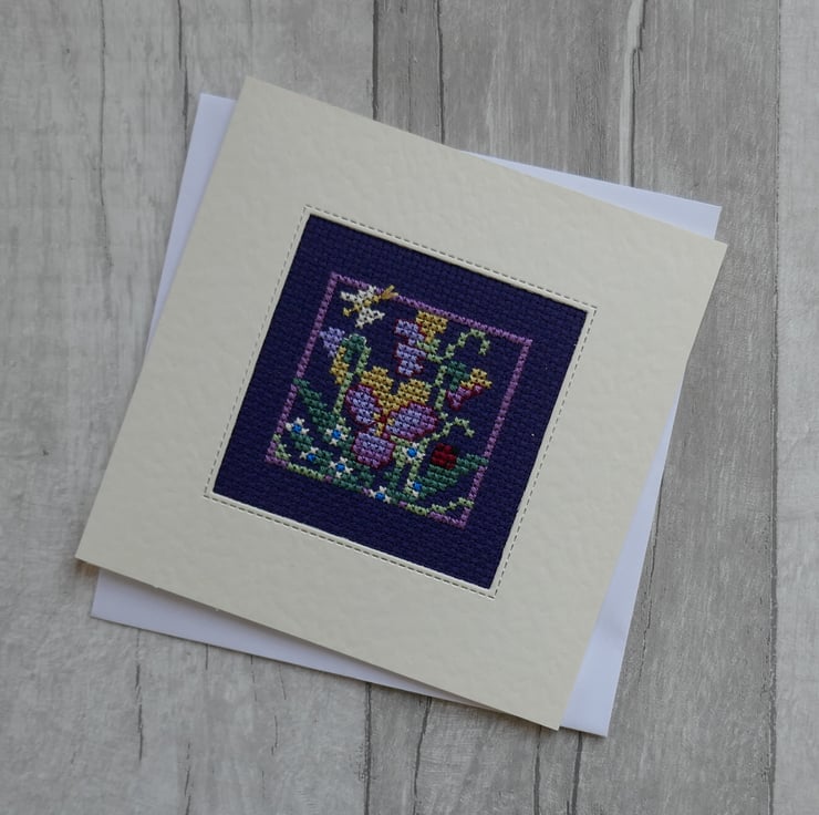 The cross stitch Mille Fleurs is from the Textile Heritage Collection. The pansy, flowers, ladybird and butterfly have been stitched onto navy fabric in shades of purple, lilac, gold, red and green. The cross stitch has been mounted behind a square stitched aperture and a piece of the same card has been attached to the inside to cover the stitching.
