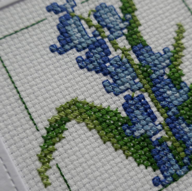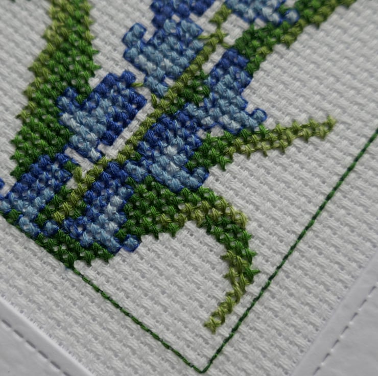 The cross stitch bluebells are from the Carolyn's Garden series by Serendipity Designs. The bluebells have been stitched in shades of blue and the leaves are in shades of green. The flowers are highlighted with a green backstitch border. The cross stitch has been mounted behind a stitched square aperture and a piece of the same card has been attached to the inside to cover the stitching.