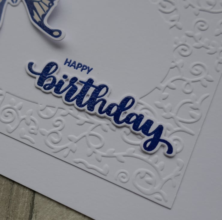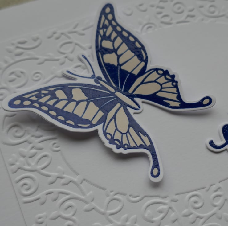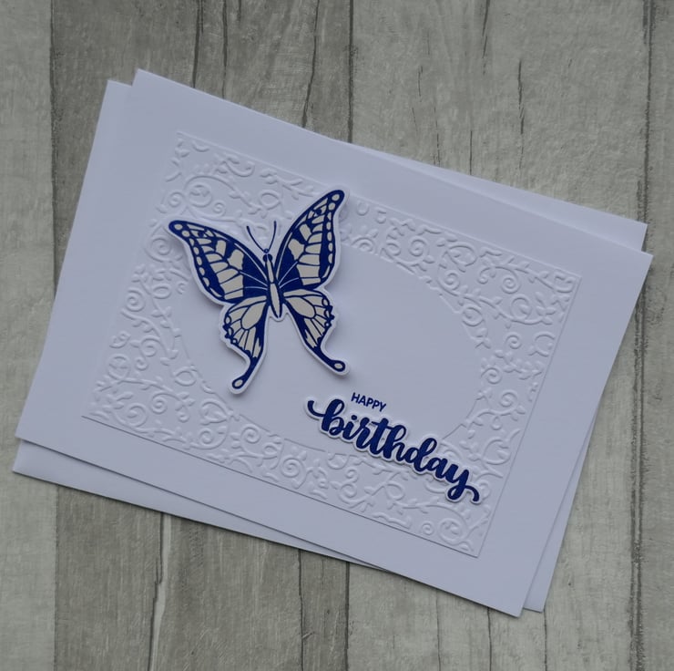 A panel of card has been embossed with a swirl frame and attached to the card. A large die cut blue butterfly has been stamped in blue ink and embossed to make it shine. It has been coloured with a cream pen before being attached to the centre of the swirl frame. 'Happy' has been stamped in blue ink directly onto the card and ;Birthday' has been stamped in blue ink, embossed and die cut before being attached underneath 'Happy'.