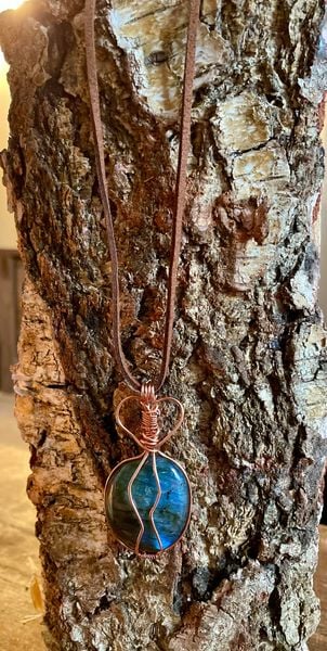 This Stunning piece of Labradorite is lovingly wire wrapped in soft copper, on an 18" Brown cord. Can be black cord or antique copper on request.