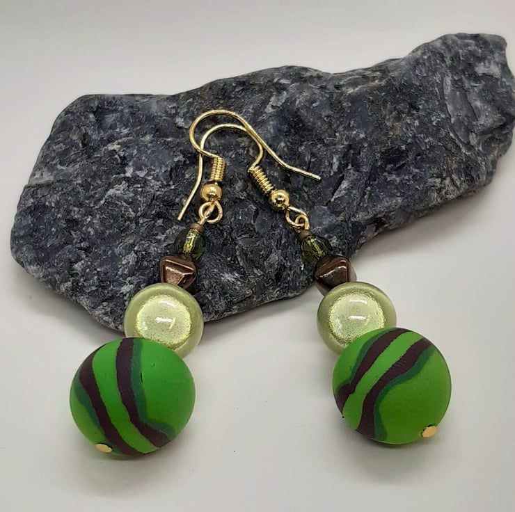 Polymer clay dangly earrings in a bright green and chocolate brown swirl design. The handmade clay bead measures approx. 14mm with an 8mm green miracle bead, bronze hexagonal and tiny lime green faceted bead to finish.