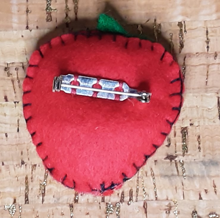 The main colour of the strawberry is red. The seeds are hand stitched in black thread. The stork is made from green felt and has a sequin held in place with a seed bead.