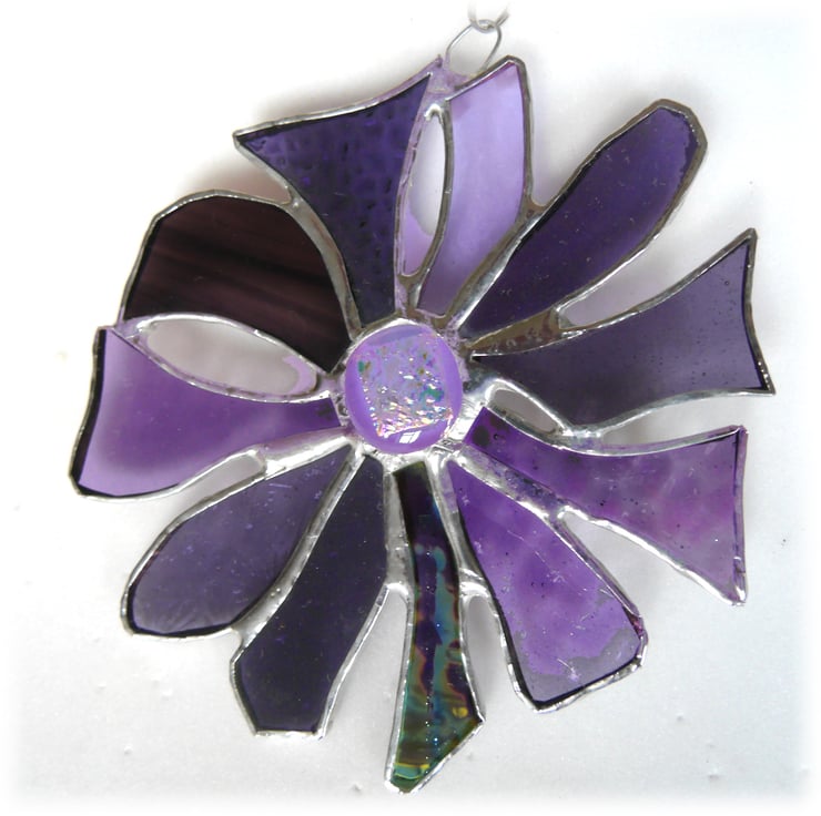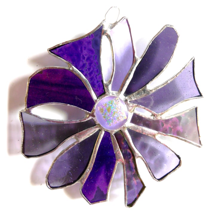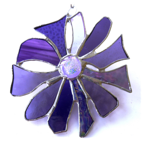 An abstract flower with 11 differently shaped petals. In the centre a dichroic glass nugget which I fused in my kiln.