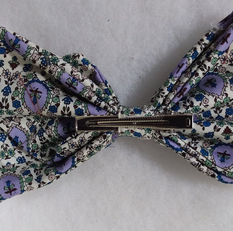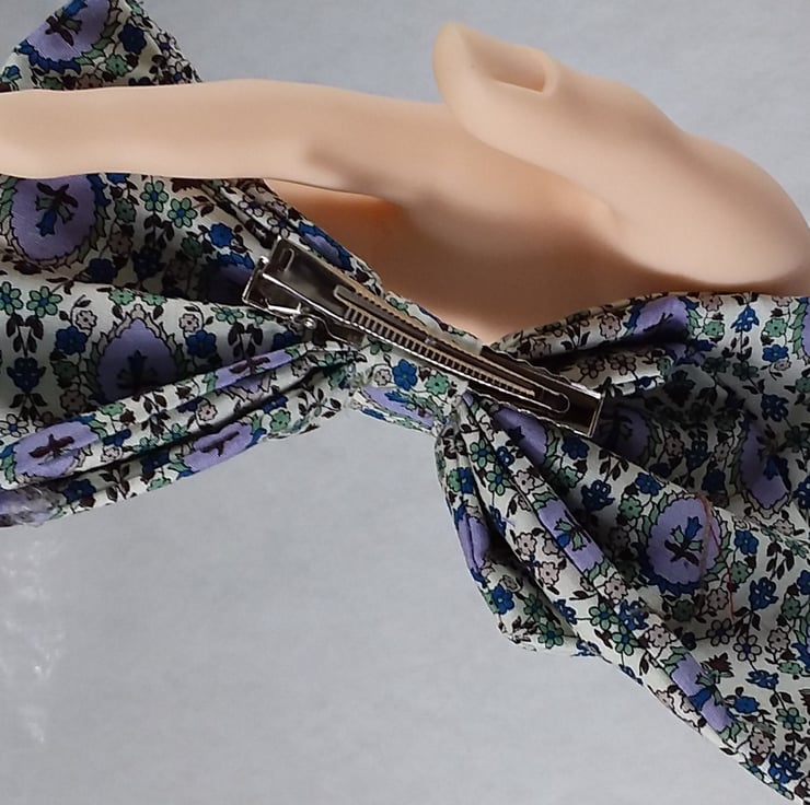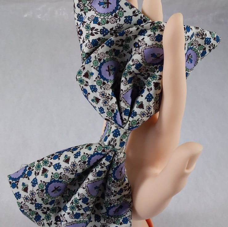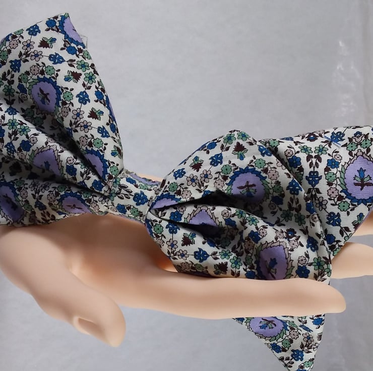 This comes in a beautiful cotton shade of pale olive, cream, and mauve. A classic bow sure to compliment almost any outfit.