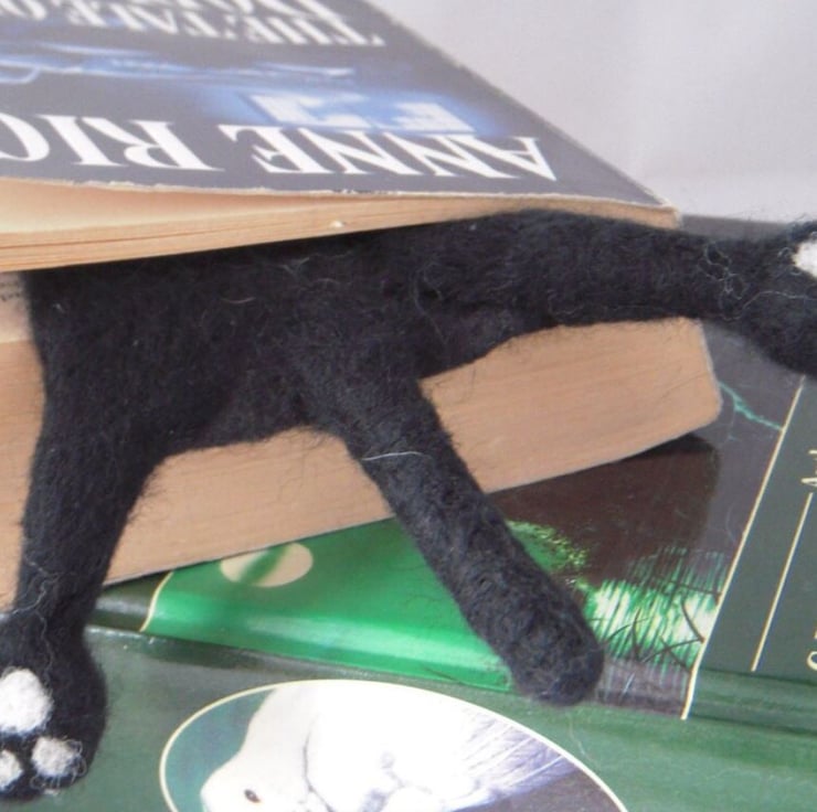 This splat is a black cat. He is the perfect size for a paperback book with his back legs (with cute paw prints) and tail poking out the back of the book.