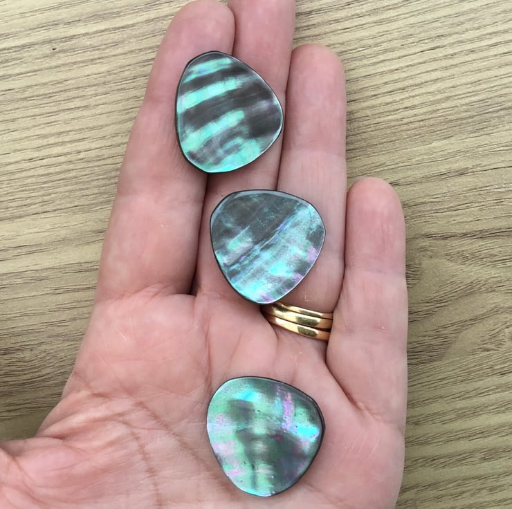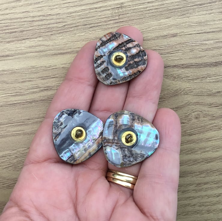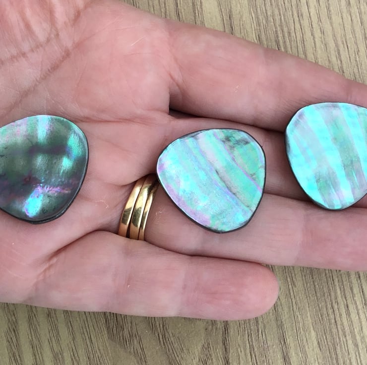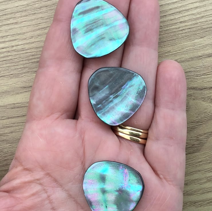 A set of 3 prestige vintage mother of pearl buttons! They are natural shell, with lots of vivid colour play, really stunning buttons. Flashes of blues, greens and purples.