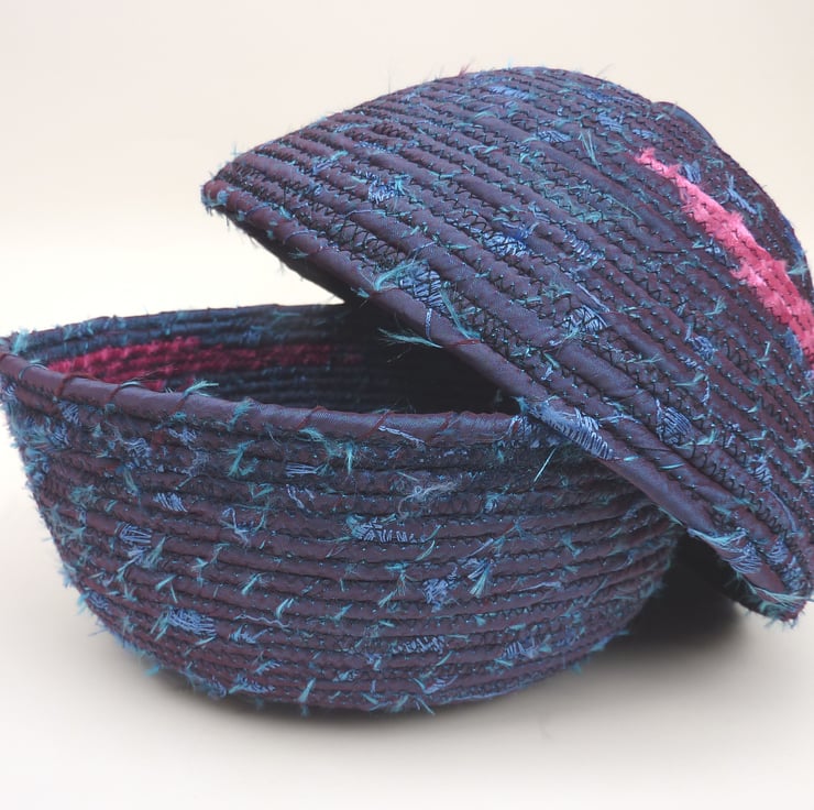 Here is a basket with a lid, I don't make them often, as a lid is just a basket upside down, so takes just as long to make! However, this coiled fabric basket in taffeta is just perfect for keeping small things tidy and out of site. What a lovely gift for a teenager going to uni - add all those sewing necessities for a useful away-from-home mending kit, or fill with something thoughtful for a new mum or as a special gift for a friend. Christmas?