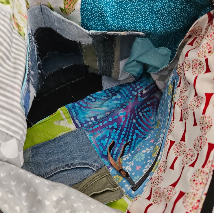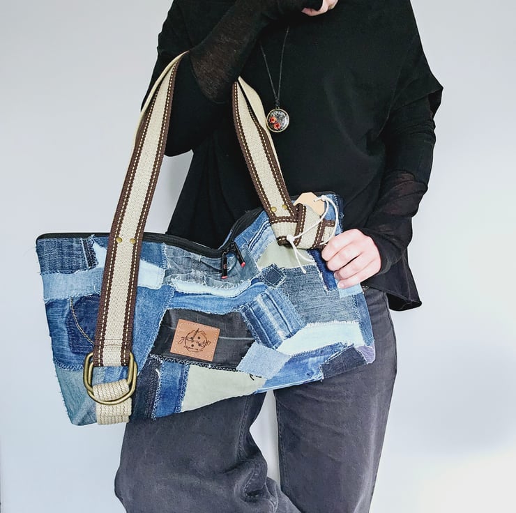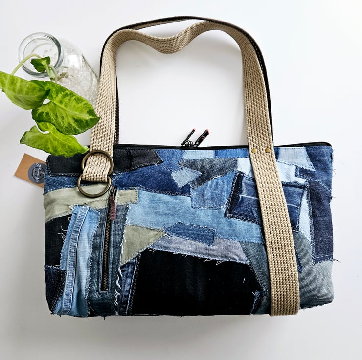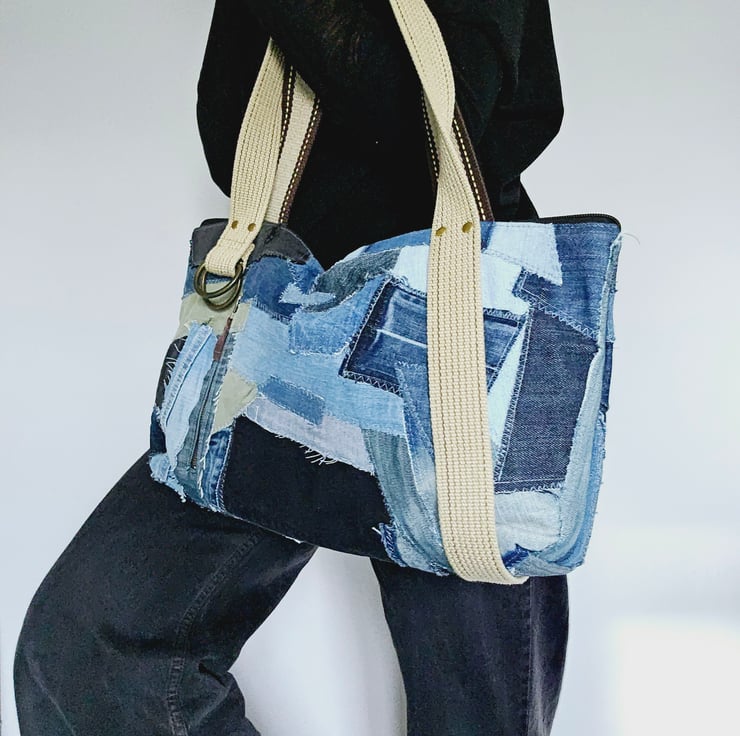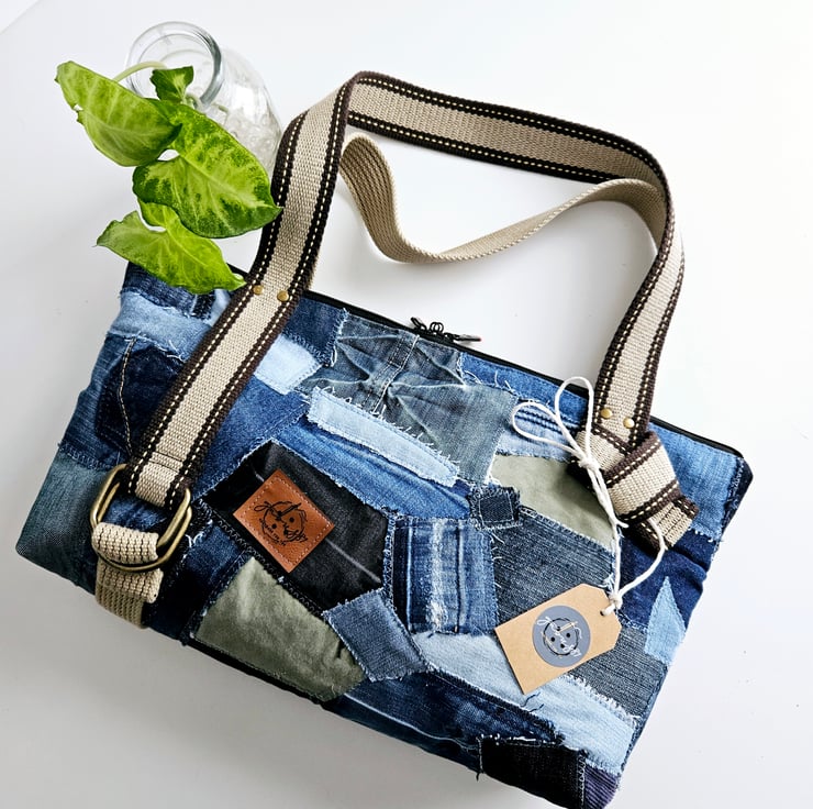 Unique upcycled patchwork jeans handbag, a one-of-a-kind accessory that combines style and sustainability.