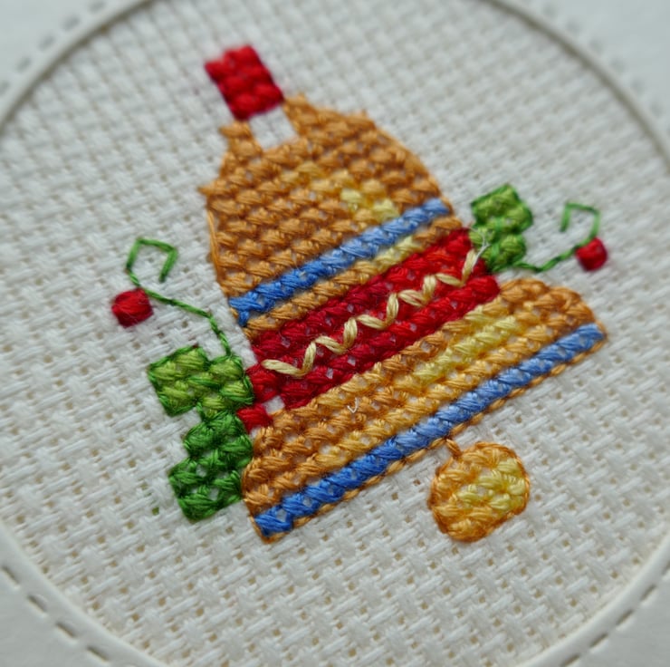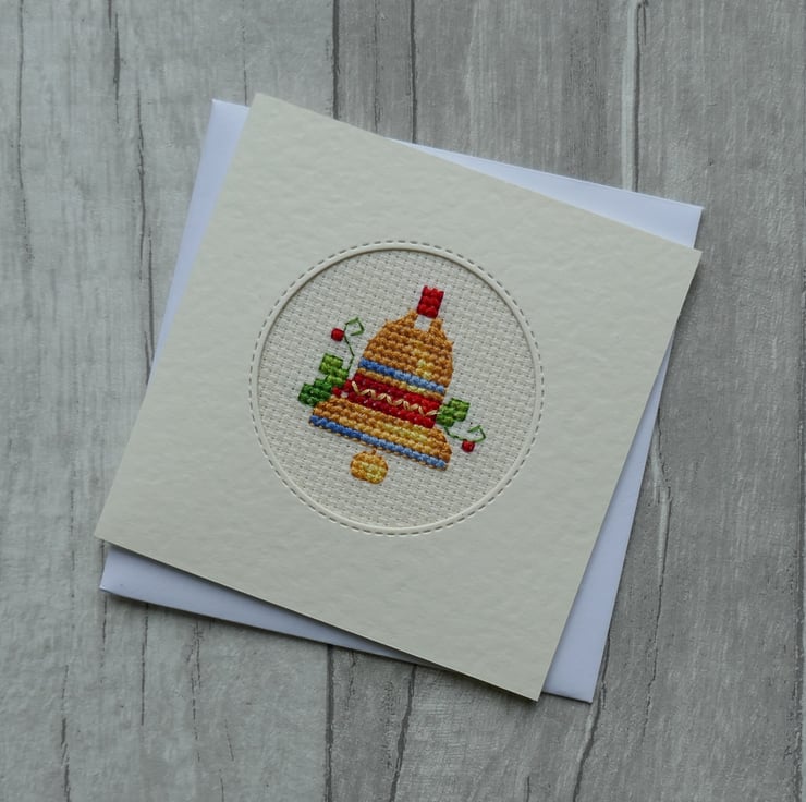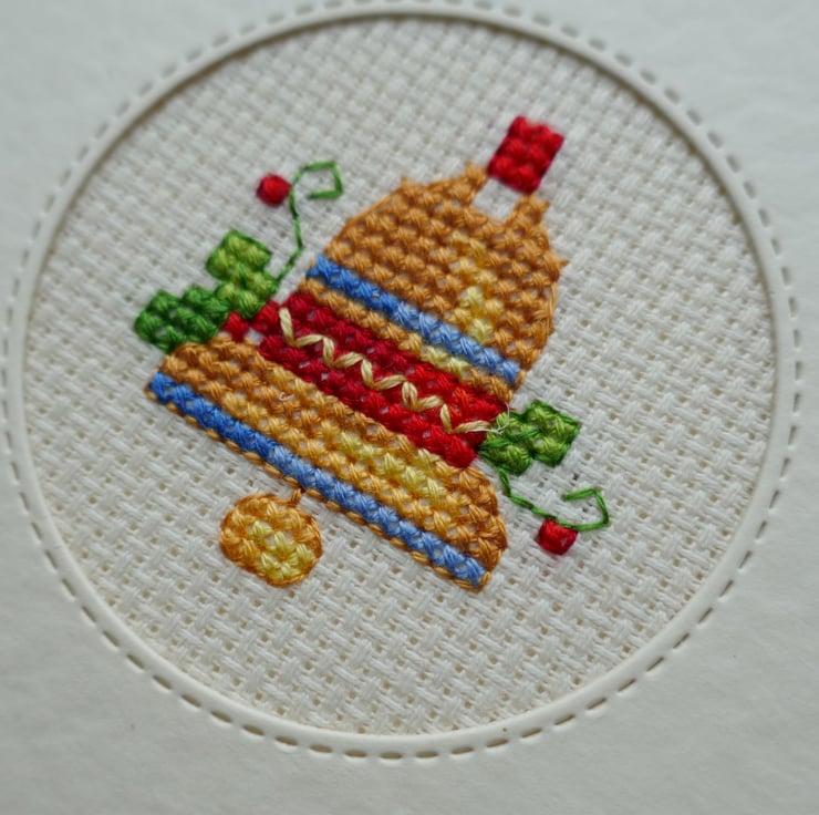 The cross stitch bell is an Anchor ‘Momentos’ design. The bell has been stitched in shades of gold and is decorated with bands of blue and red stitching. There are also sprigs of holly stitched on both sides of the bell. The cross stitch has been mounted behind a round stitched aperture and a piece of the same card has been attached to the inside to cover the stitching.