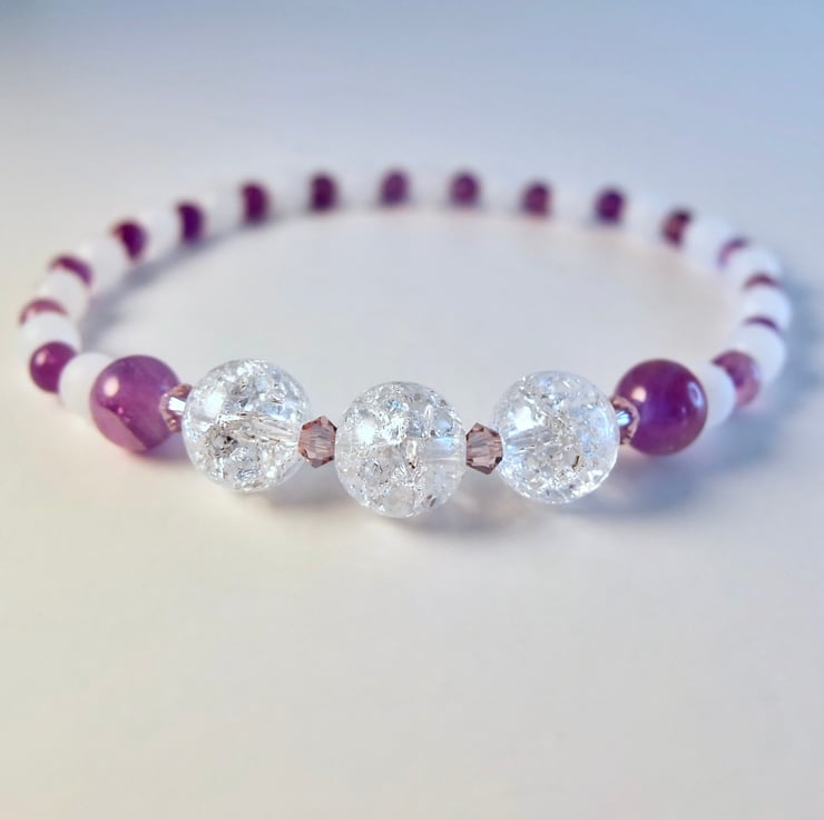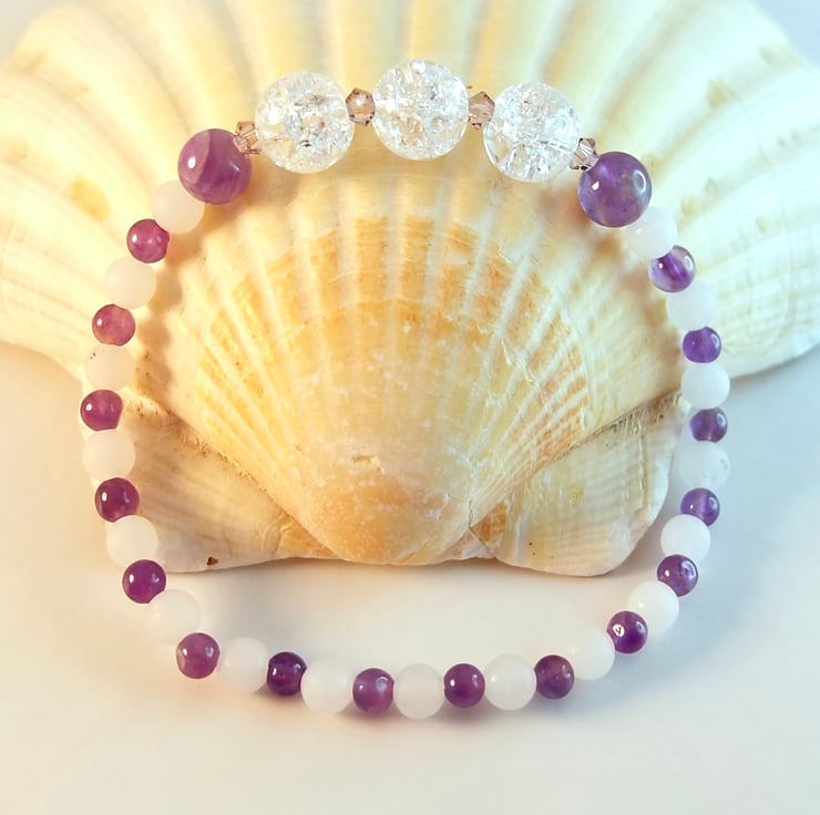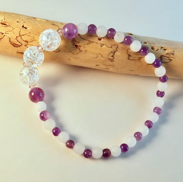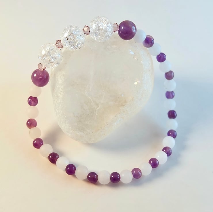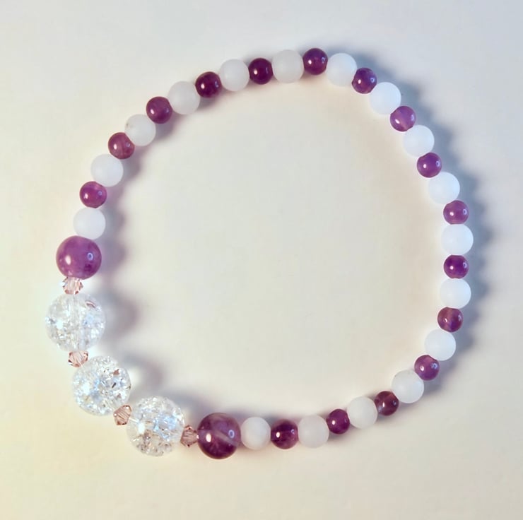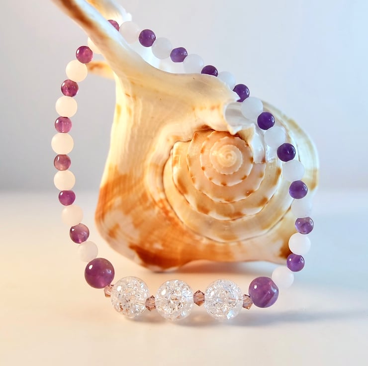 This pretty stretch bracelet has a centrepiece of three 8mm Crackle Quartz beads, set between a pair of 6mm polished Amethyst rounds and separated with sparkly 3mm Swarovski 'light lavender' bicones.