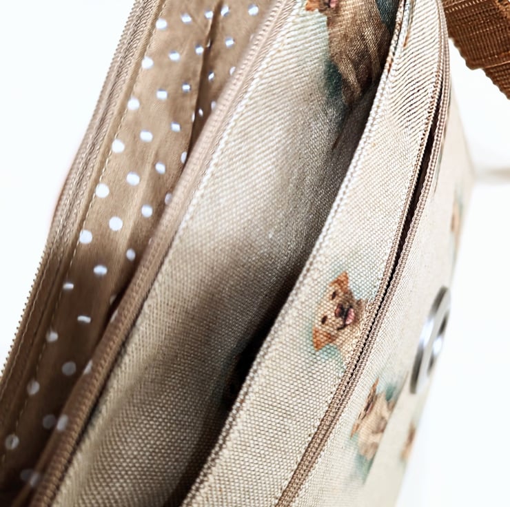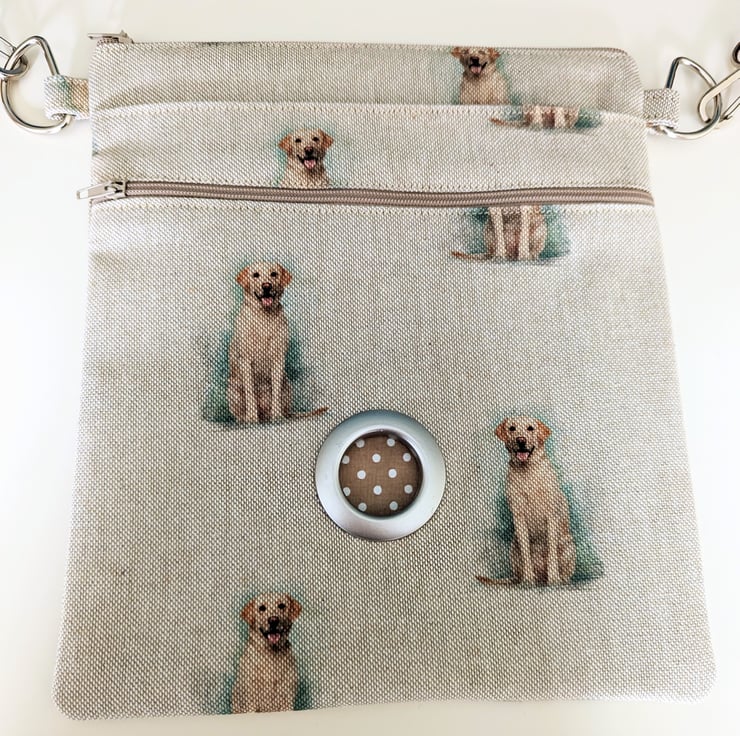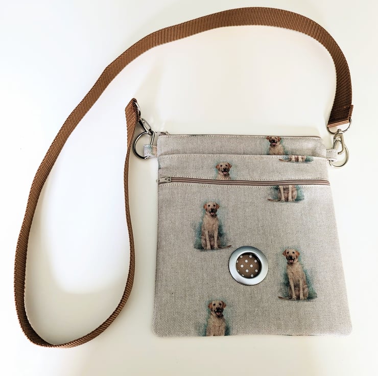 This is a dog walking bag made in Golden Labrador fabric