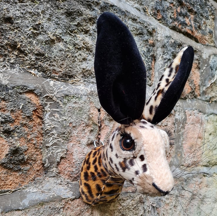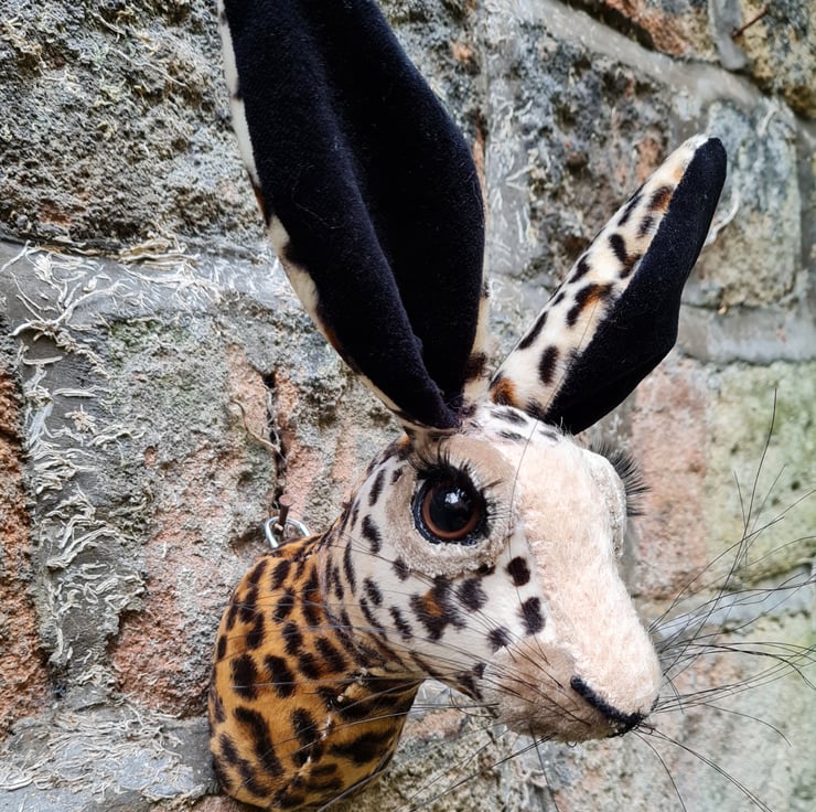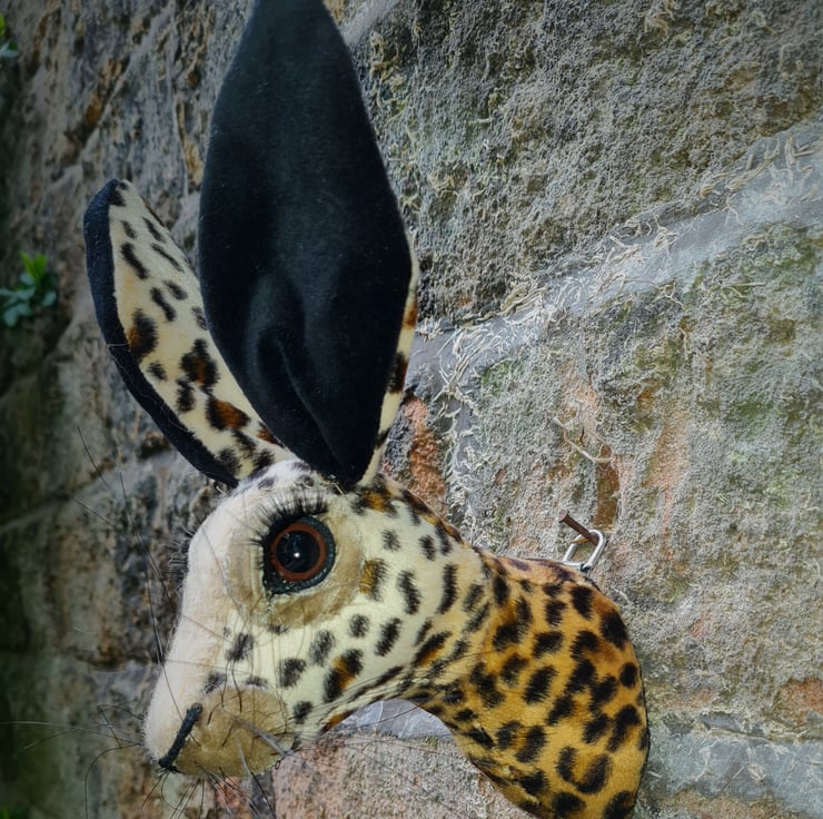 A lifesize faux hare which I have handmade and covered in hand stitched faux cheetah velvet fabric. The head is backed with felt and has a metal hanger to hang it on the wall. It is lightweight.