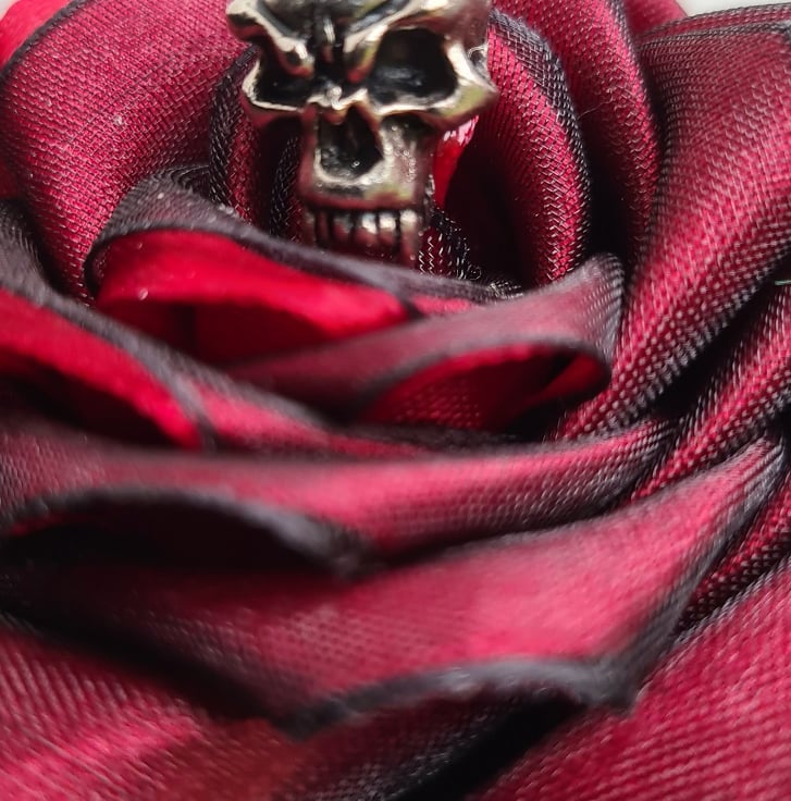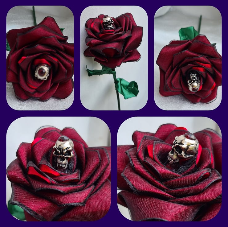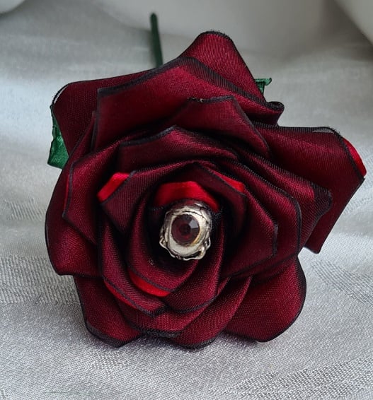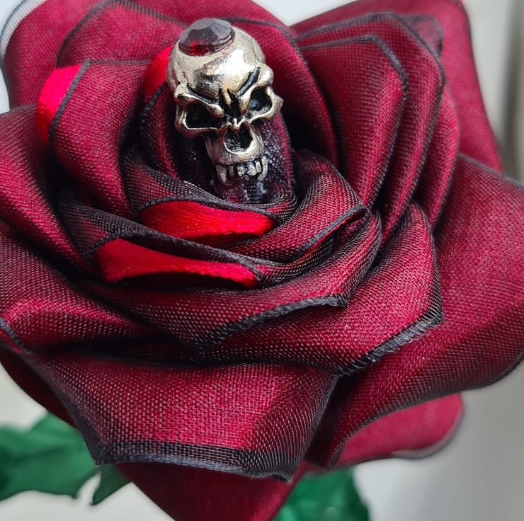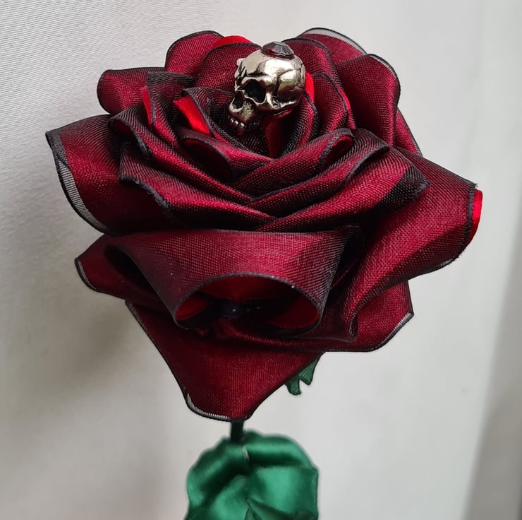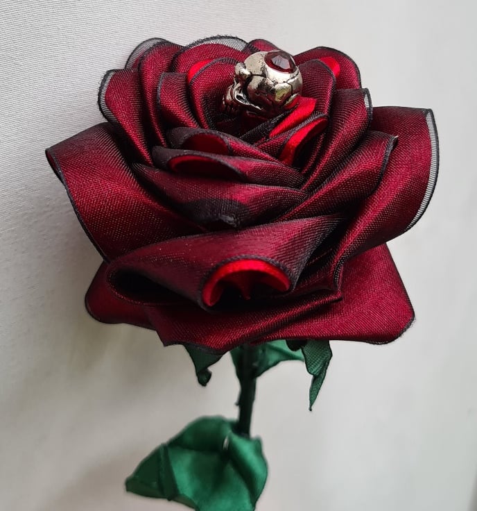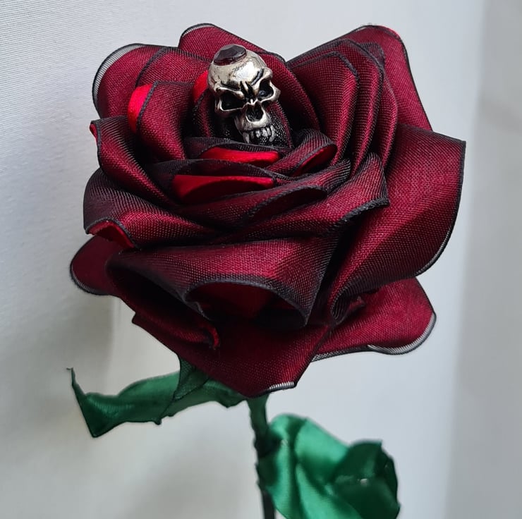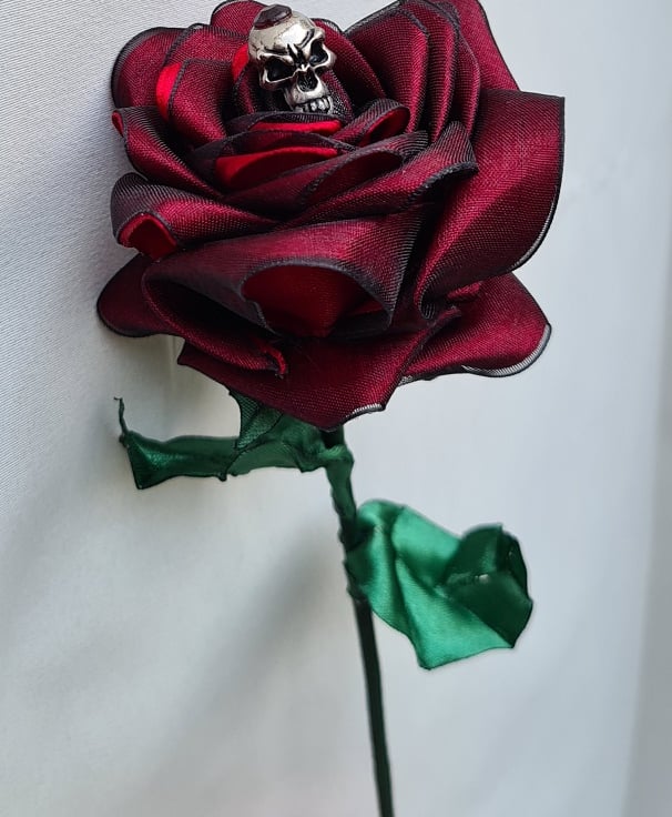 A gorgeous handmade single stem rose (one flower only), made with beautiful Burgundy Red Satin (Polyester) ribbon and Black Organza Ribbon. The Black Organza is wrapped around the Burgundy ribbon giving it a darker sheen. The stem is made from bamboo (Non-bendy) and wrapped in Green florist tape with Dark Green Satin ribbon leaves. The centre of the Rose contains a metal Vampire Skull Charm bead with a red jewel in its skull.