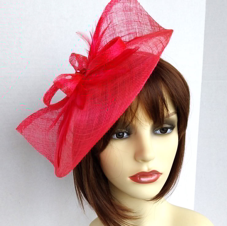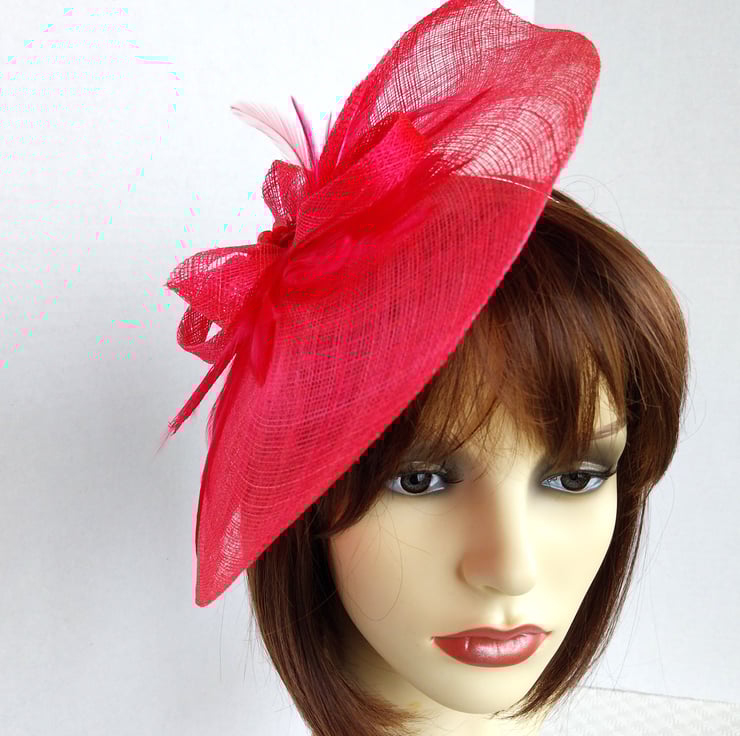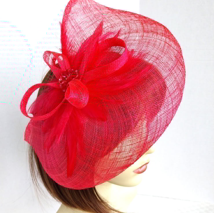 This very pretty and feminine fascinator is made of fuchsia sinamay to form a half rim. It measures29cm at the widest part and is 16cm from back to front. It is decorated with sinamay ribbons, fine hackle feathers and a sequin and bead applique. The fascinator sits on a thin silver-coloured headband. It is light and airy.