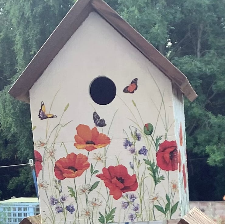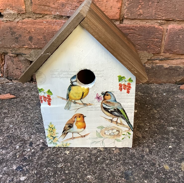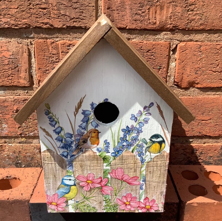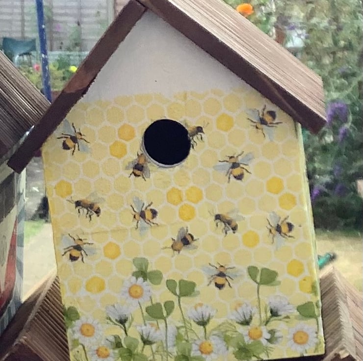 The Nesting box is made from wood & decoupaged then varnished with an outdoor varnish