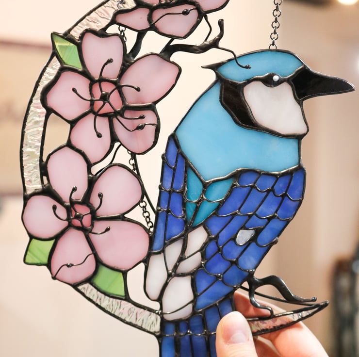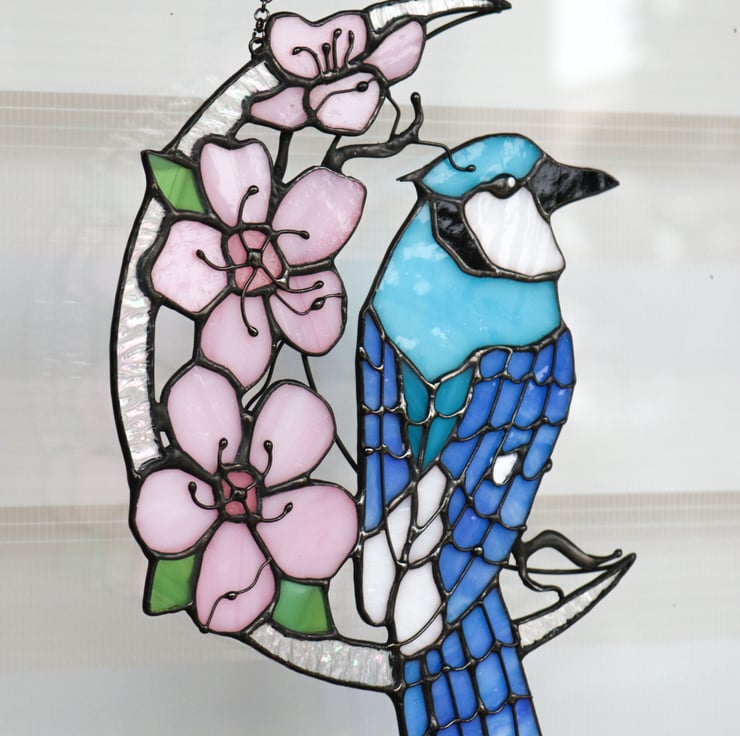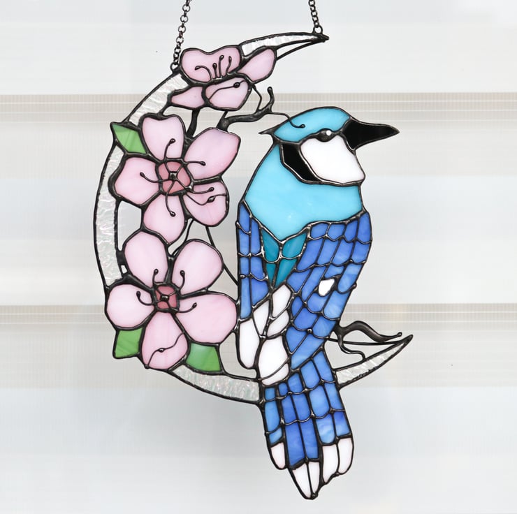 Spring and bright Blue jay with sakura on the moon. Gentle, shiny and bright decor. This is a great gift for those who love flowers and birds. The moon is made of iridescent glass that shimmers in different colors, it looks incredibly beautiful in real life. After receiving this product, you will be pleasantly surprised by the quality and beauty of our product. Jay is a symbol of will and freedom.