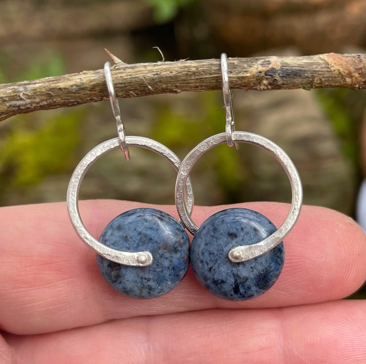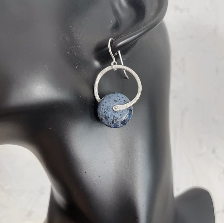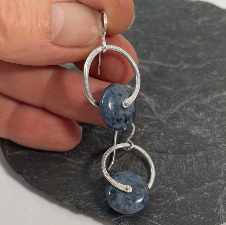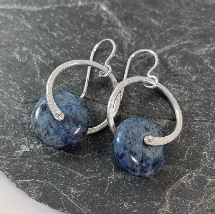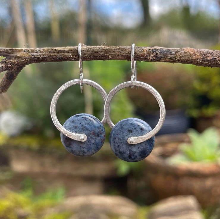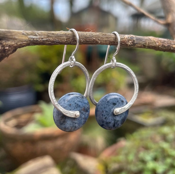 Big roundels of denim blue dumortierite are held in a textured ring of sterling silver and hung from handmade hooks.
