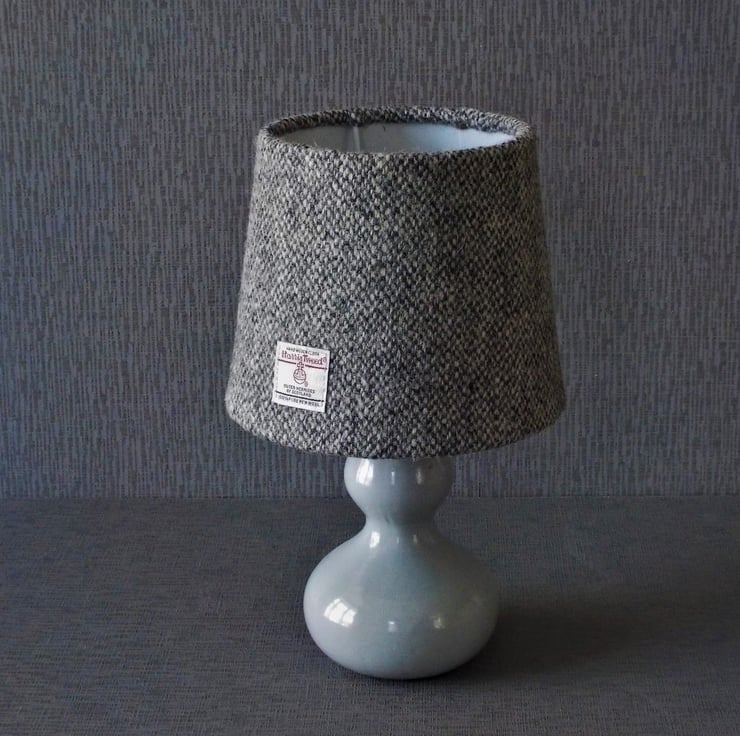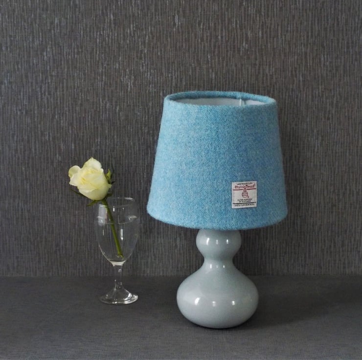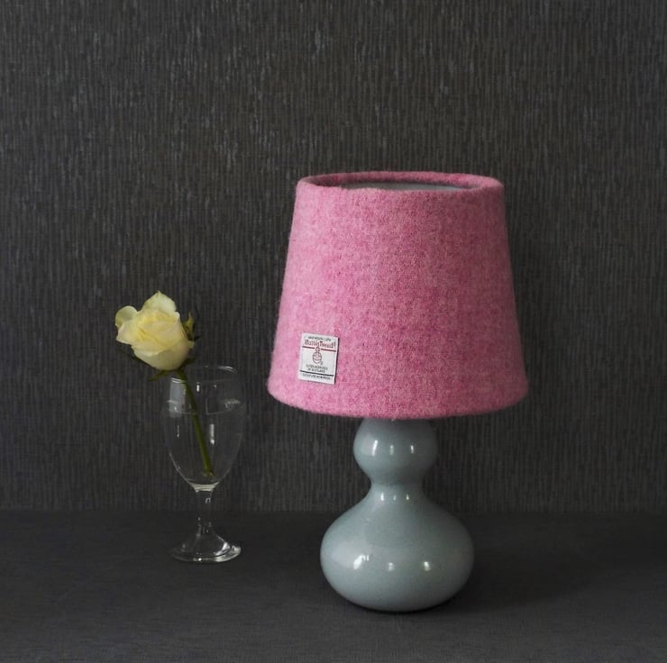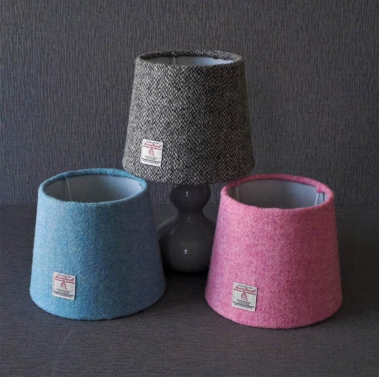 Sweet little lampshades handmade from Harris tweed handwoven fabric. Ideal for a table lamp or bedside light. Choose your colour from the selection of pale blue, pale pink, or mottled grey. Inside is the standard fire-retardant pvc, safe to use with regular 40W candle bulbs or 8W low energy bulbs.