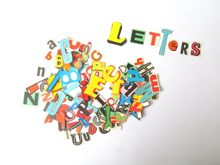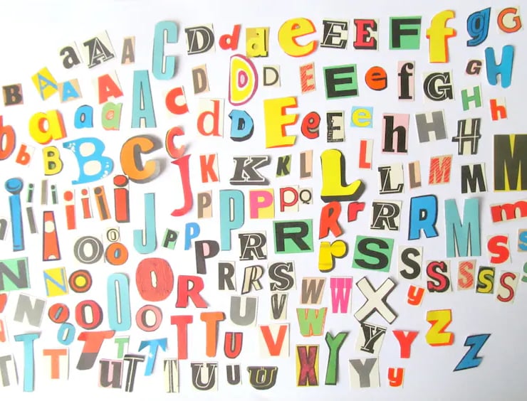 Included in each pack are a selection of letters hand cut from books and magazines dating from the 1920s to the 1980s in a variety of colours.