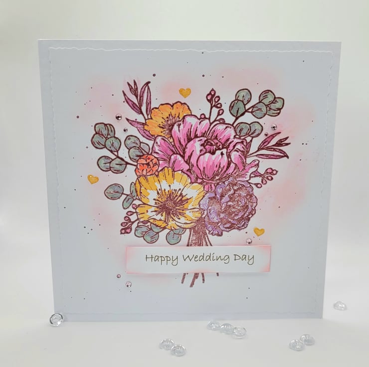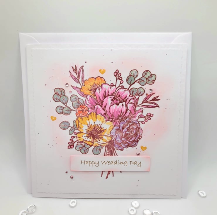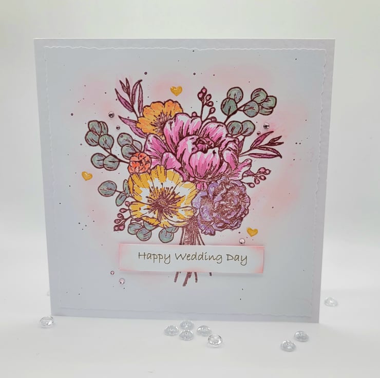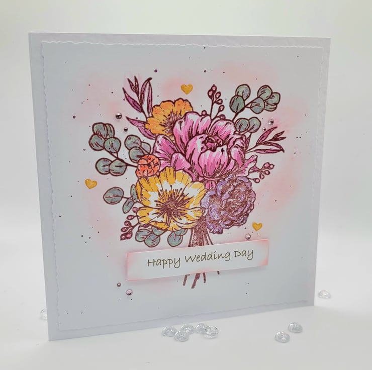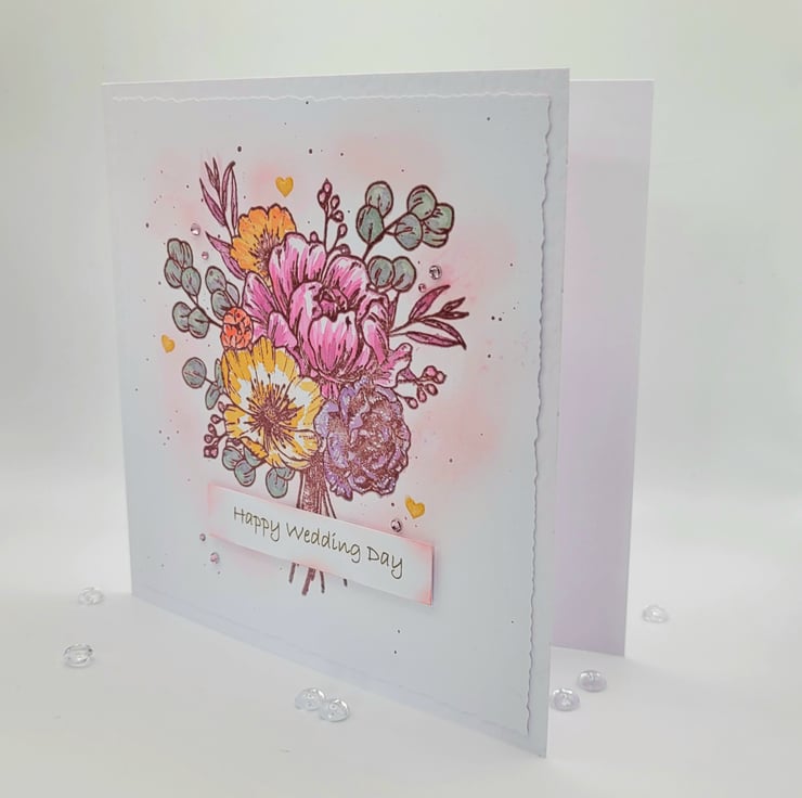 A wedding card, individually handmade layered and textured, with a clean and simple floral design. This lovely embossed card measures 14.5 x 14.5 cm and is blank white inside for writing a personal message. Featuring a boho style wedding bouquet which I have stamped and heat embossed, then watercoloured by hand. A truly unique and special card for a wedding celebration.
