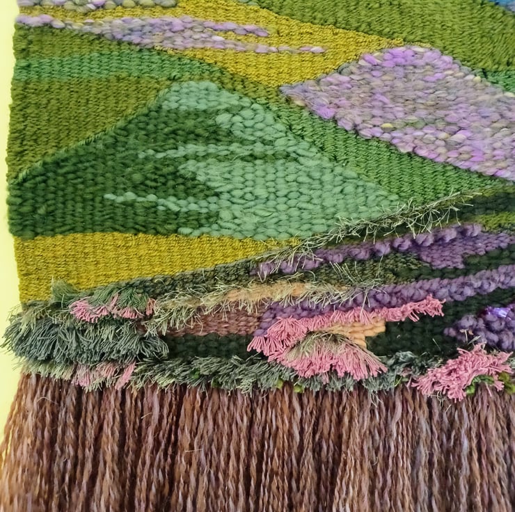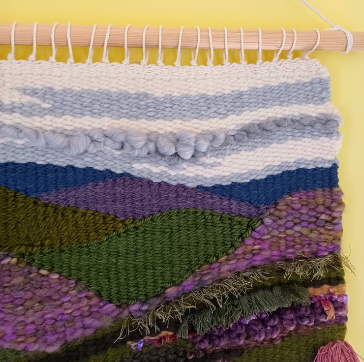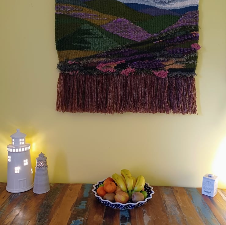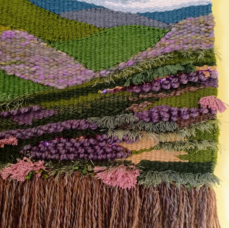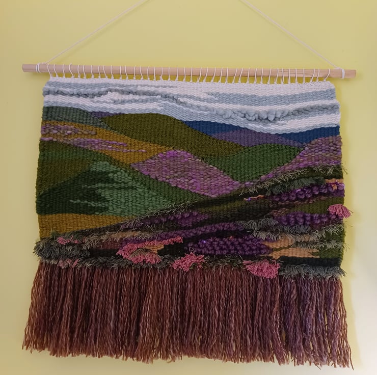 This woven wall hanging was inspired by my walking in the Peak and Lake Districts. Beautiful undulating hills covered in heather, grasses and ferns. Made from various yarns, acrylic, roving, wool, eyelash yarn and frayed cotton cord, the differing textures of these yarns convey a real sense and atmosphere of the hills I've enjoyed walking on and around.