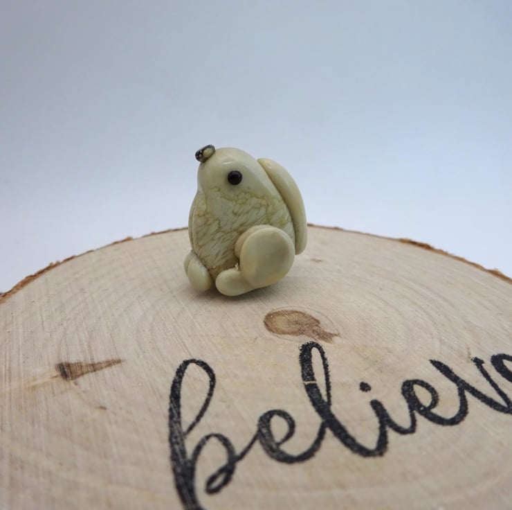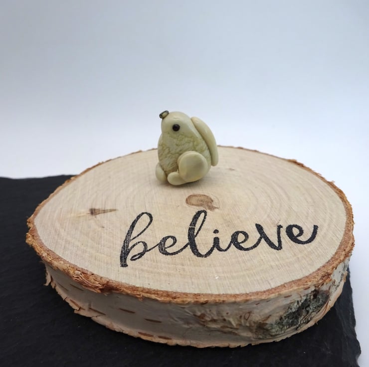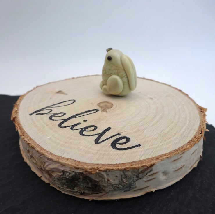 A wood slice which features a handmade lampwork glass hare. The word 'believe' has been hand stamped on the wood.