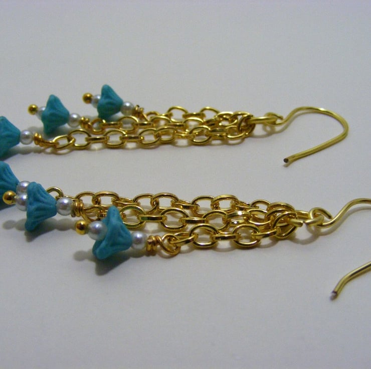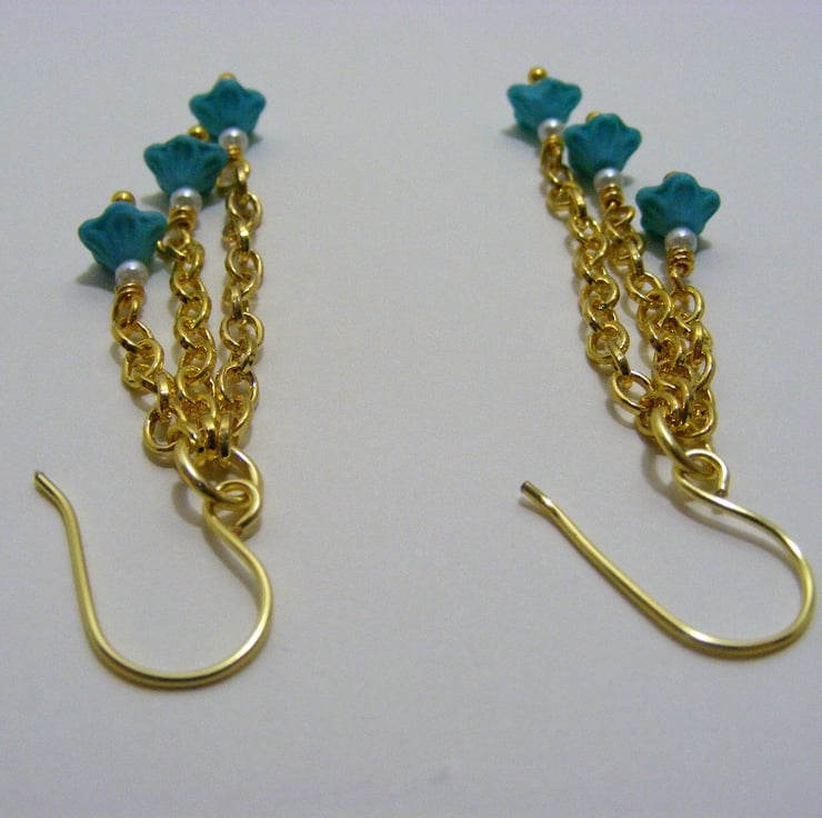 I've handmade this lovely flower jewellery set which consists of a necklace with matching earrings. Set is made with, 7x5mm matte teal glass flowers, 2mm white glass pearls, gold plated headpins, chain, lobster claw clasp and hypo allergenic wire to make the ear wires.