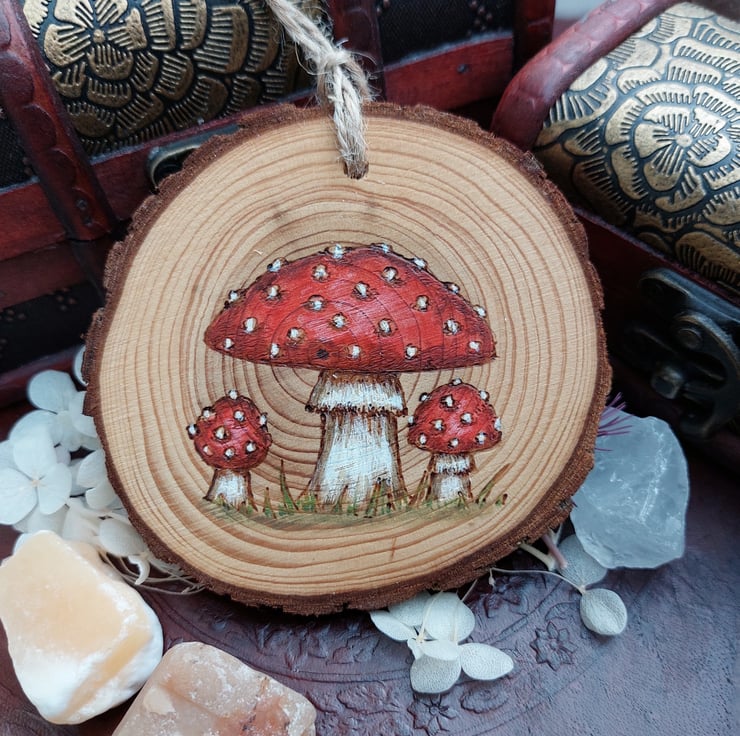Fly agaric is the classic looking red toadstool. Ideal for lovers of cottage core this unique, hand painted log slice has been created using pyrography, which is burning on wood, and coloured with artists ink and coloured pencils. The piece is finished with linseed oil.