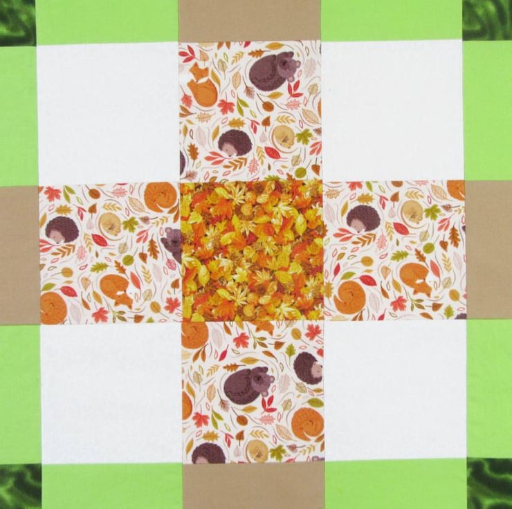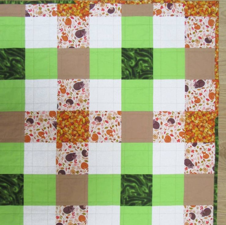 A bold and cheerful patchwork throw in a mix of bright Spring greens and mellow Autumnal oranges and browns. The light orange print contains images of animals curled up for a Winters nap - bears, hedgehogs, dormice and foxes.