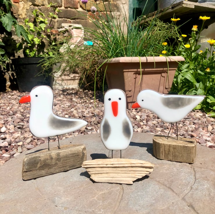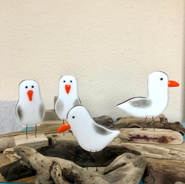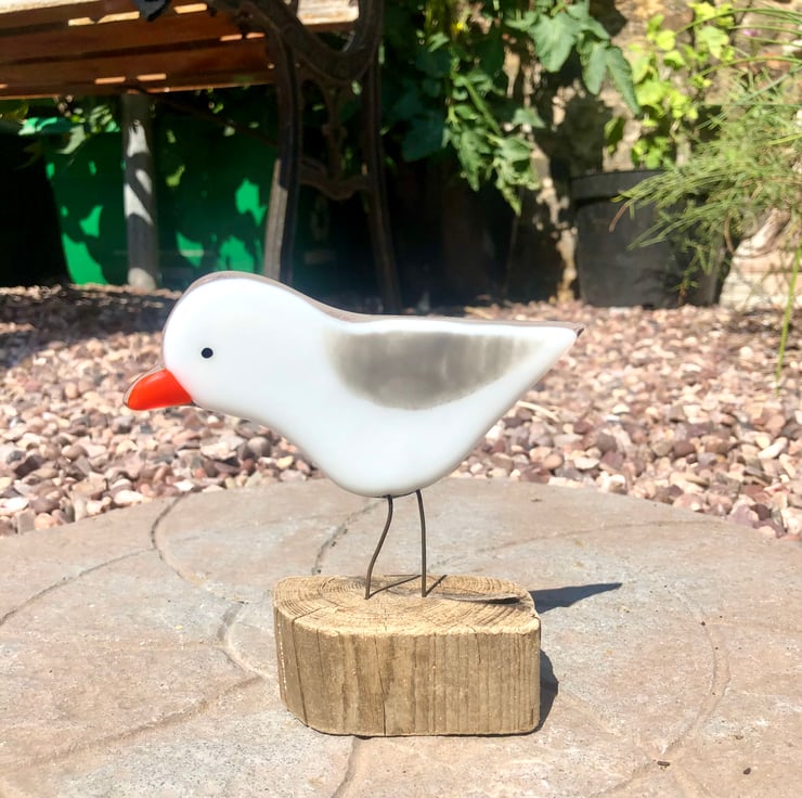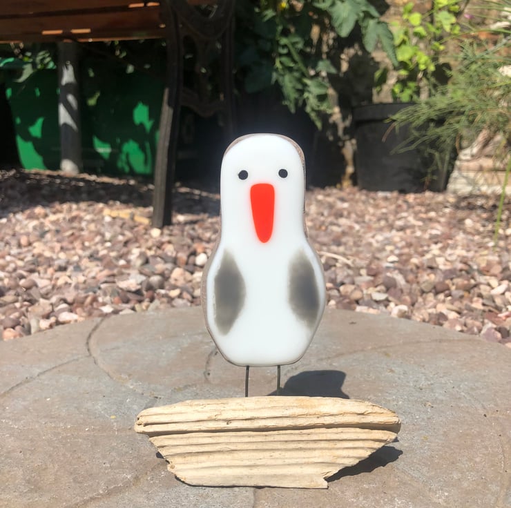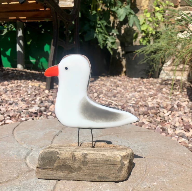 Cute fused glass seagull on driftwood .