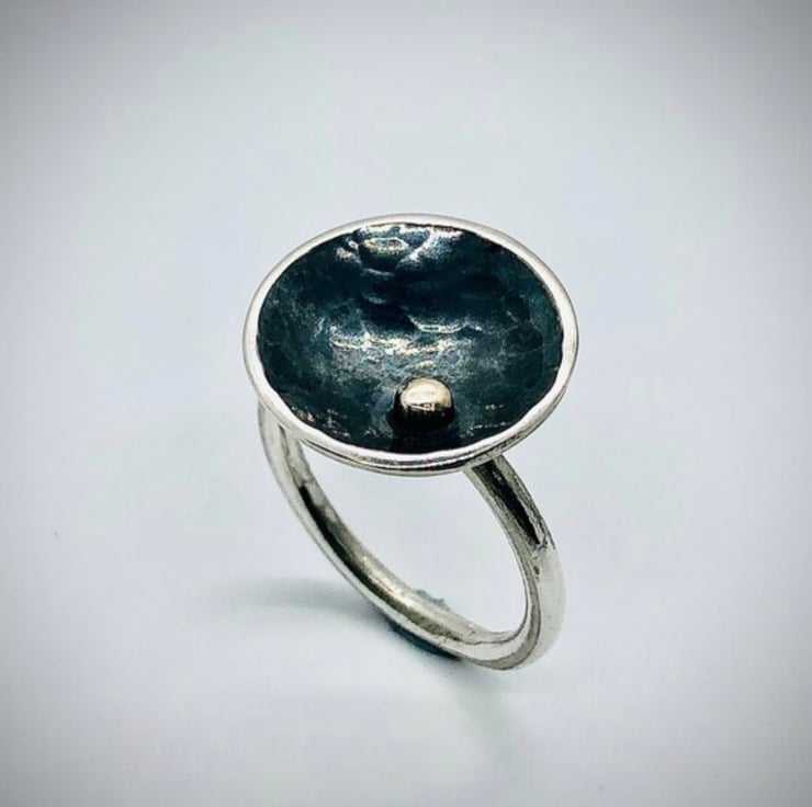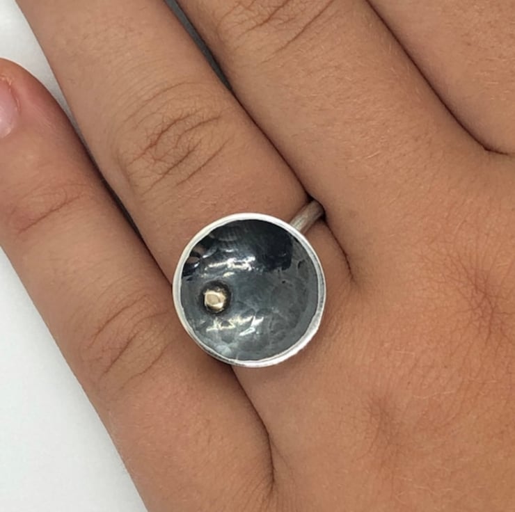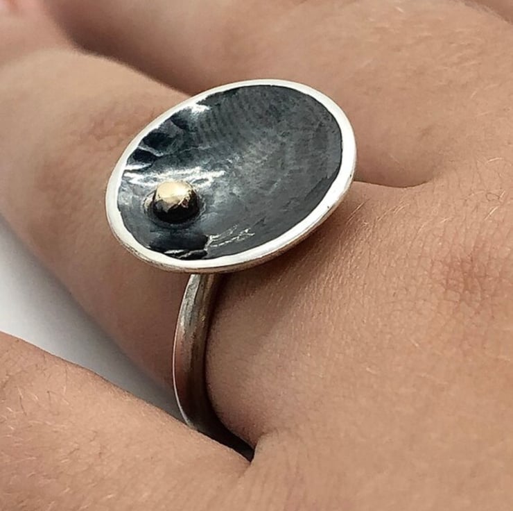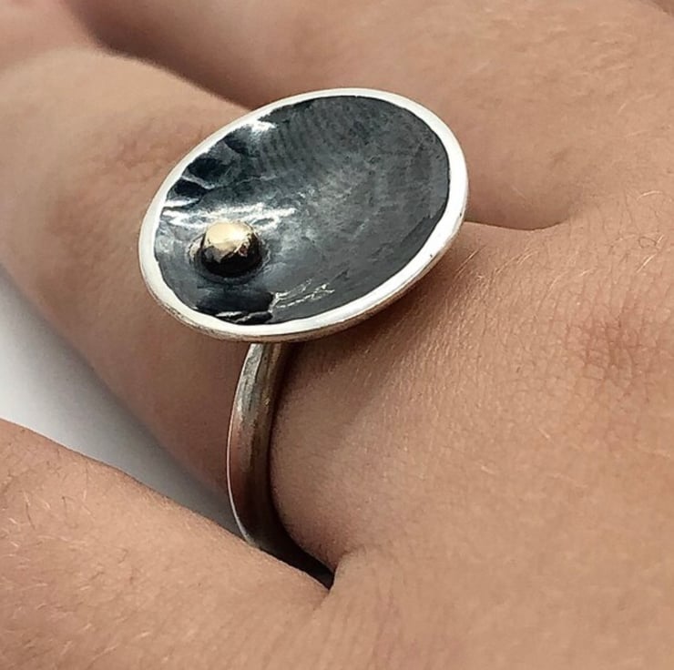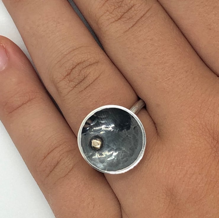 This statement ring is made from Sterling Silver and 9ct gold detail. The concave shaped cup which has a diameter of approx: 1.5cm, has been hammered textured and oxidised which gives a dramatic contrast to the gold dot detail. The ring shank is a D Shape 3mm and has a smooth, high polished finish. Please let me know the size you require at Checkout.