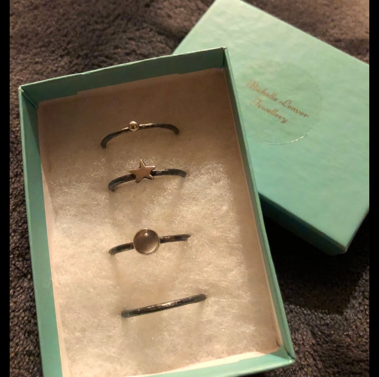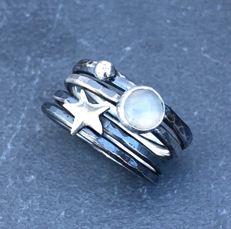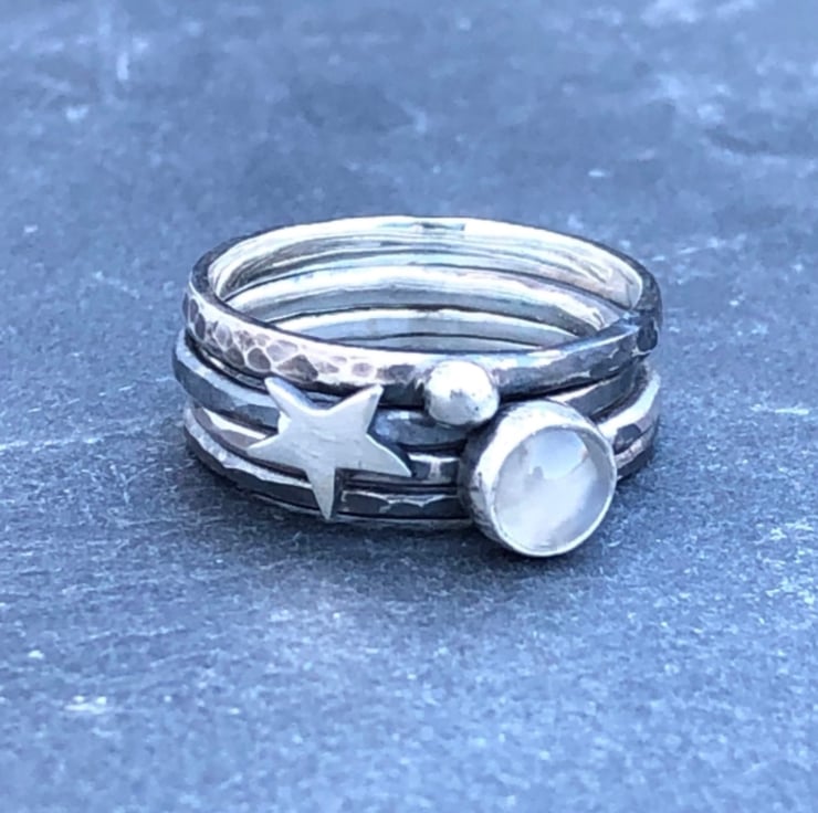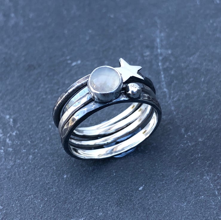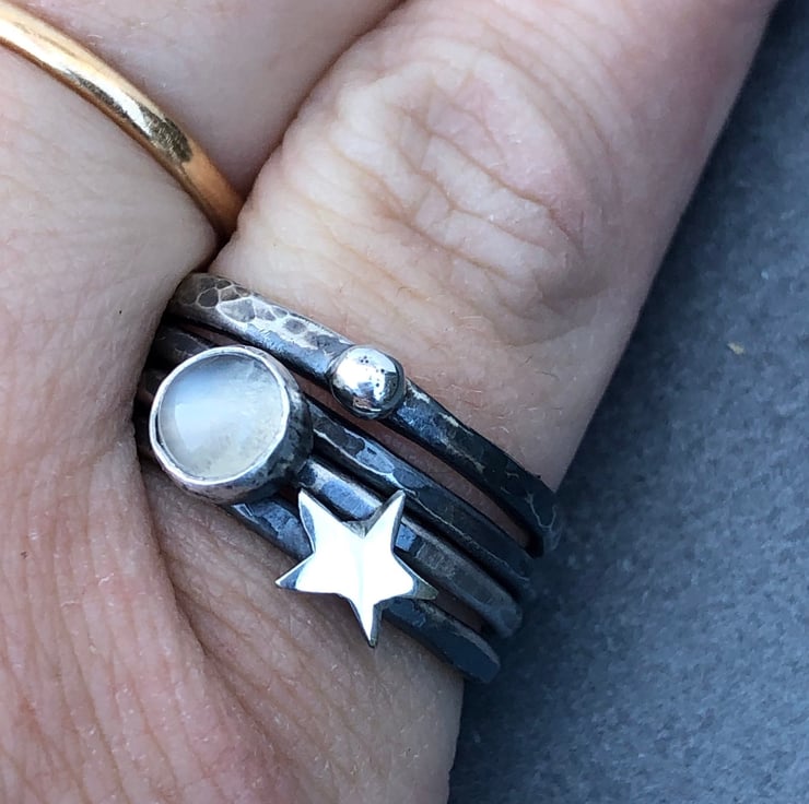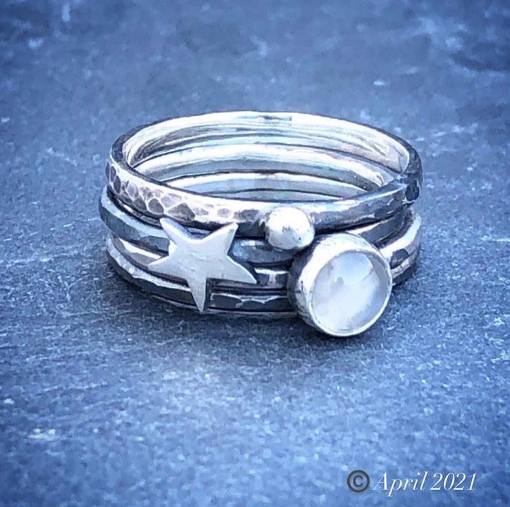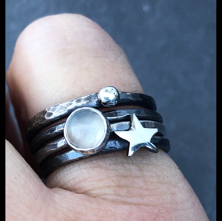 The ‘Moonstone stack Ring’ made from oxidised, Sterling Silver has a 5mm round Moonstone. The four hammer-textured rings are high polished on the inside. The first ring is a plain hammered ring, the second has the Moonstone, the third has a shiny silver ‘planet’ and the last one has a silver star. It was inspired by sleepy hollow moons and beautiful moonlight shining down through the dark of night. The four rings all together have a diameter of approximately 8mm.