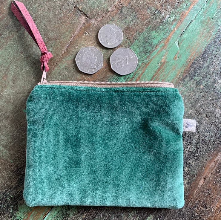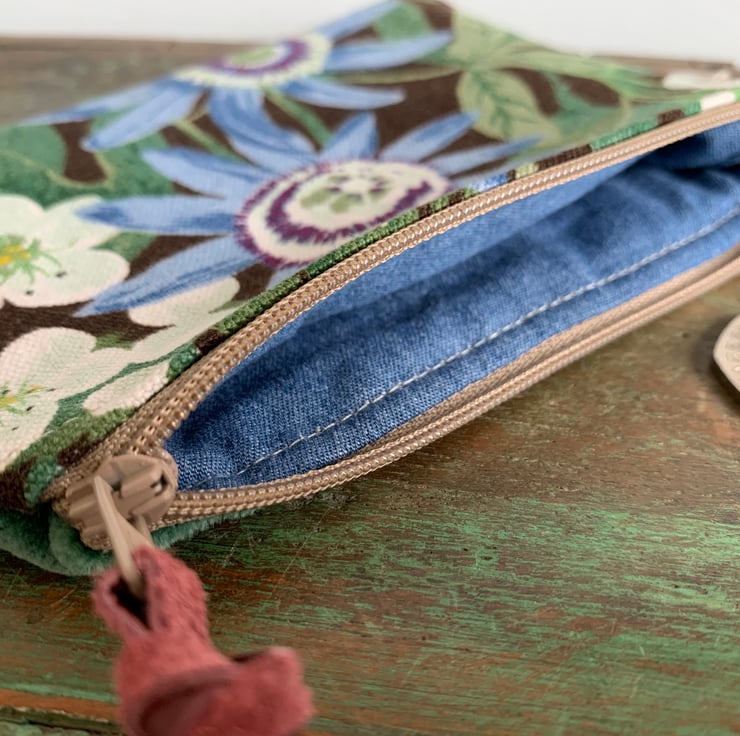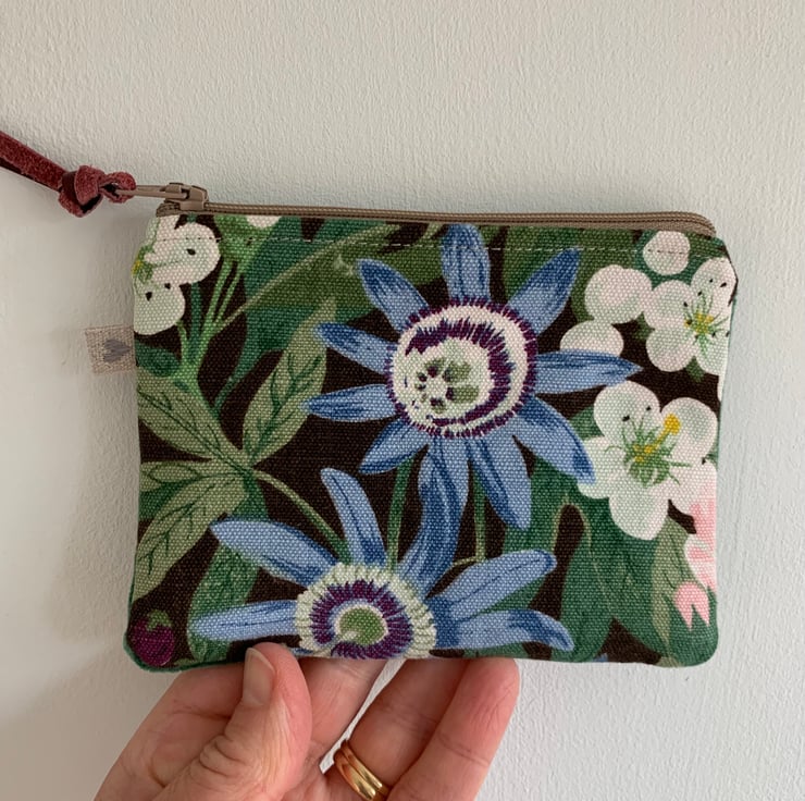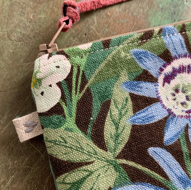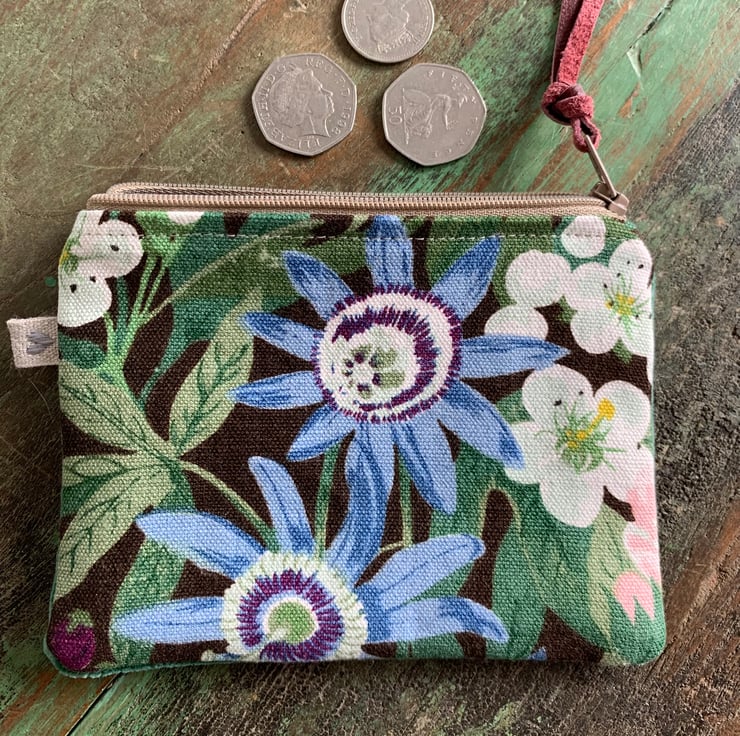 Cute little coin purse made from vintage Jonelle linen union in Belinda print with pretty passion flowers. It is backed with green velvet and lined with blue cotton.