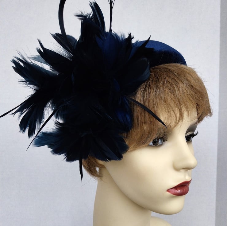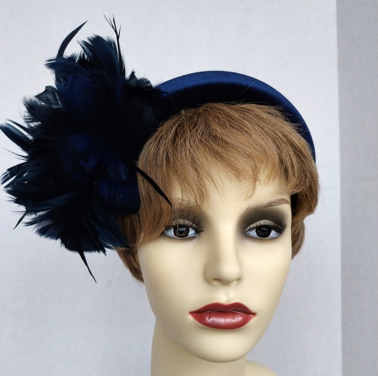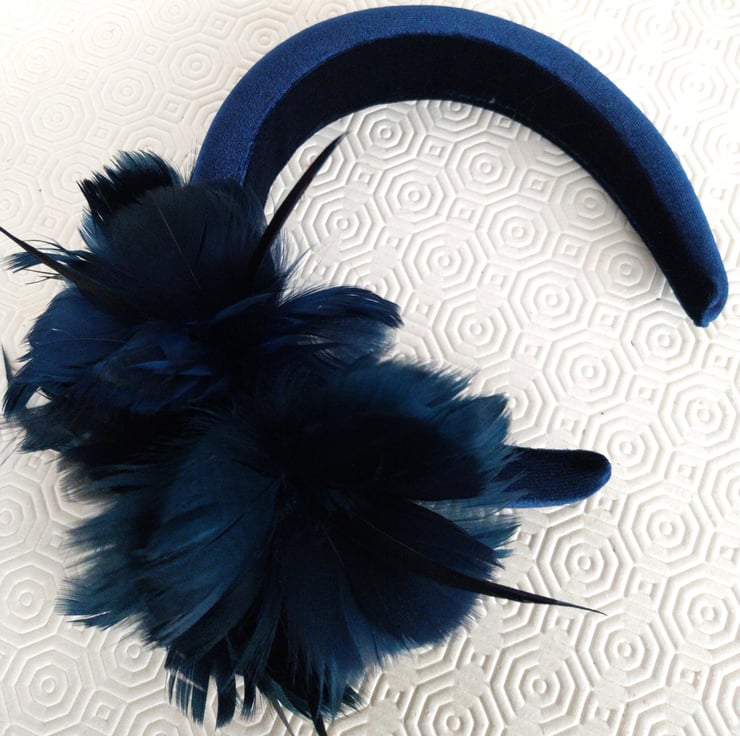 I love the deep rich navy colour. Padded headbands are very popular and adding feathers to it makes it look more like a fascinator.