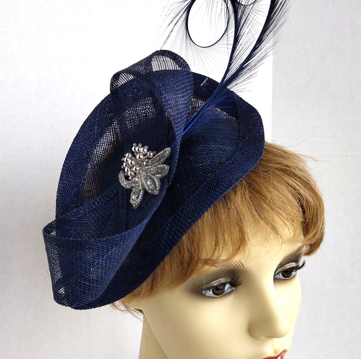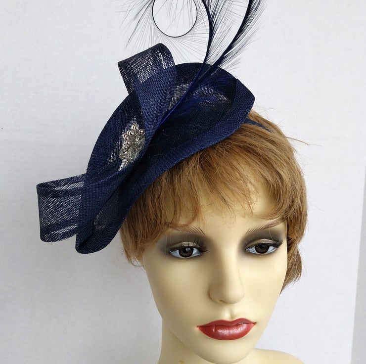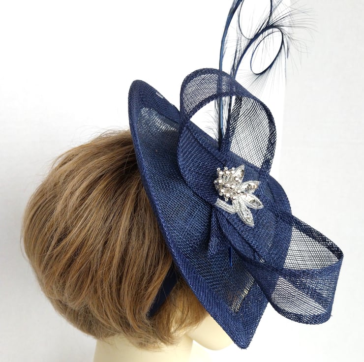 This navy fascinator is made of a sinamay base shaped like a teardrop. It measures 23cm in length and 16cm in width. It is decorated with a sinamay ribbon and two curled feathers. It is further embellished by a sparkling silver sequin and bead applique. The fascinator sits on a fabric covered headband.