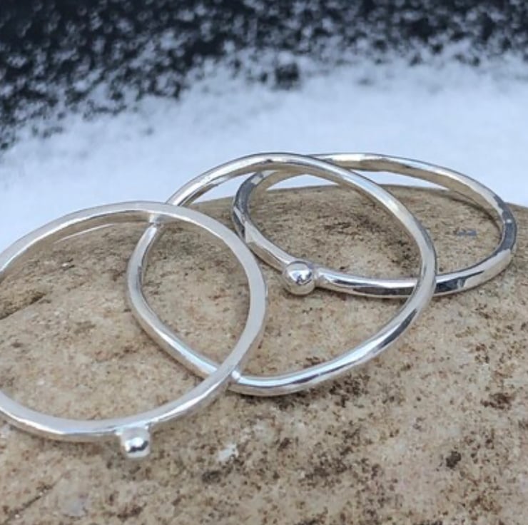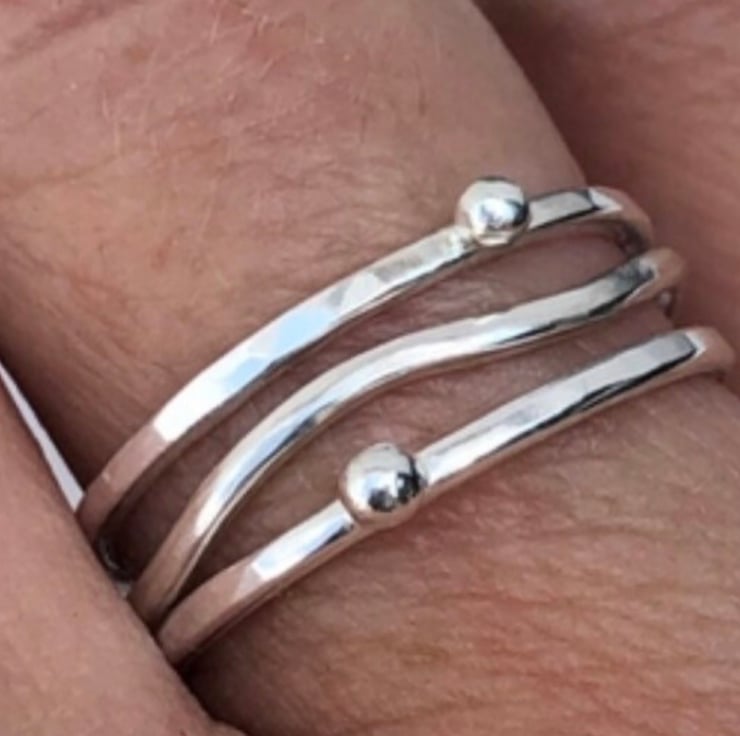 This Sterling Silver stack ring is made up of three beautiful rings. One is a wavy ring and the other two are hammer textured with a silver ‘water drop’ detail.