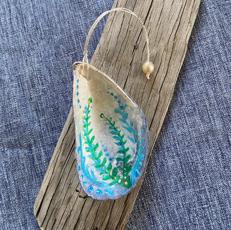This one of a kind hand painted mussel shell was collected whilst beach-combing on the shore near my home. Painted with acrylics in an ethereal, floaty design reminiscent of the seaweed and underwater beauty beneath the waves. The inside of the shell is painted with the outside left in its natural form.