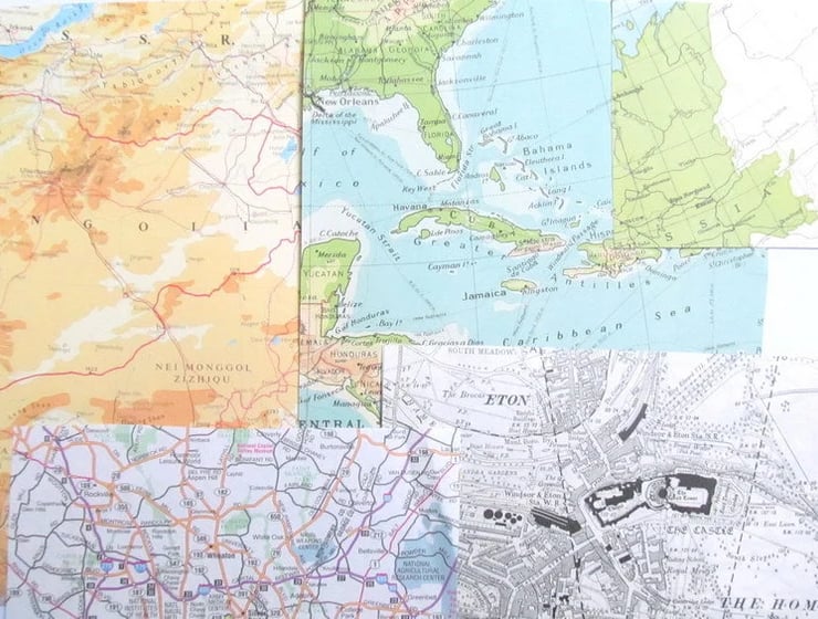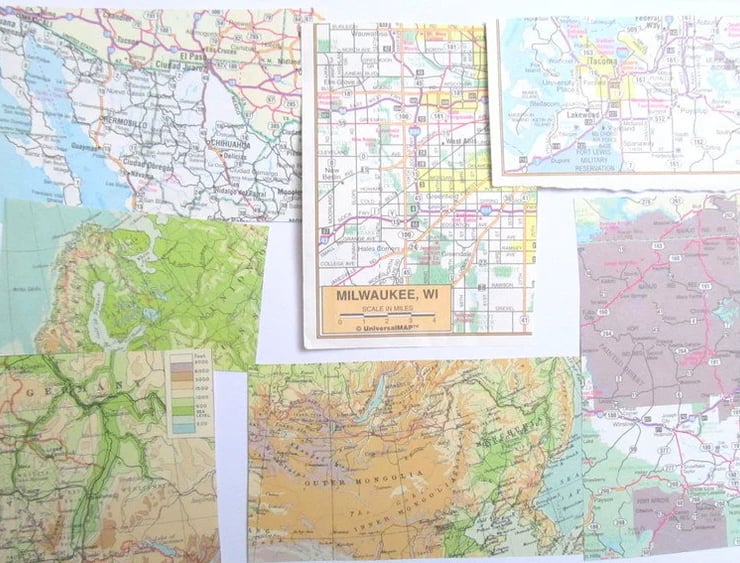Included in each pack are a selection of map scraps hand cut from various sheet maps, atlases, and books dating from the 1920s to the 1980s. They show a variety of places from around the world in both colour and black & white.