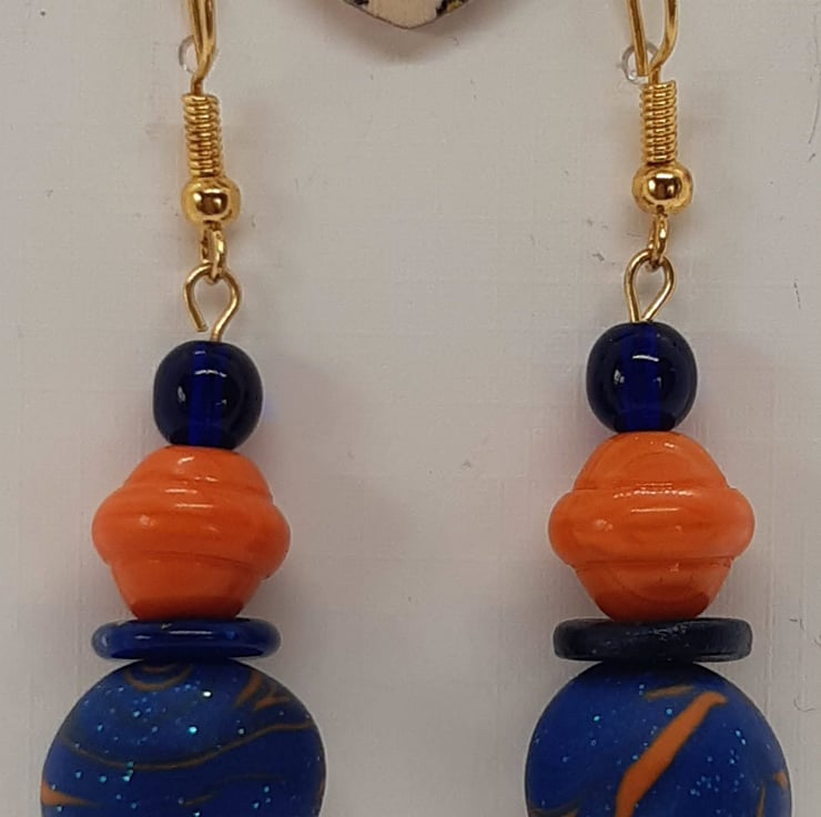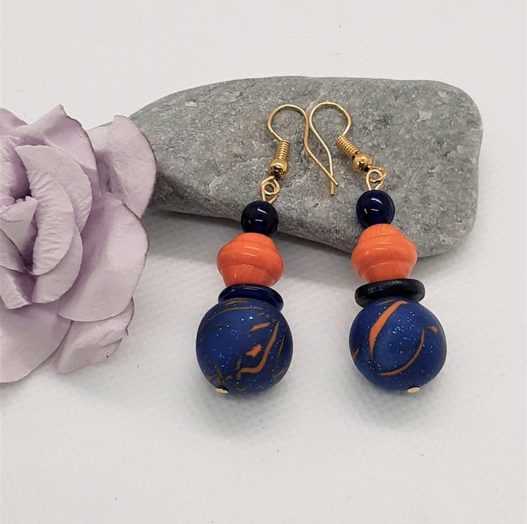Handmade polymer clay dangly earrings in a royal blue and orange swirl design with a touch of sparkle