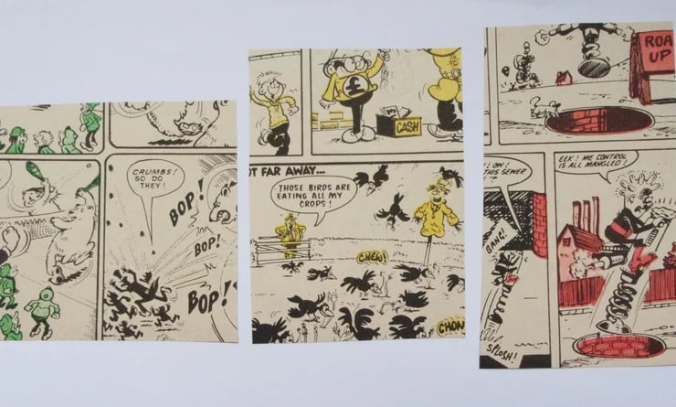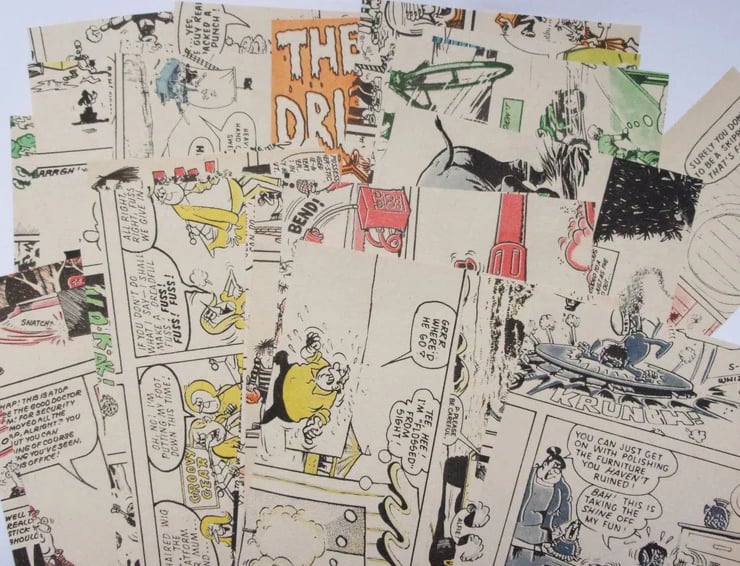 Included in each pack are a selection of scraps hand cut from various comic books and children's annuals dating from the 1960s to the 1980s. They show a variety of character in both colour and black & white.