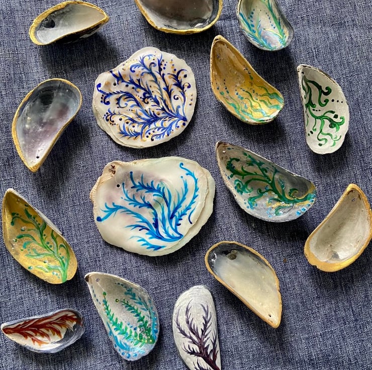 I started to paint deer skulls and antlers found on the hill then when beach-combing I decided to also paint shells. The delicate insides seemed a challenge to decorate and to add individual designs.