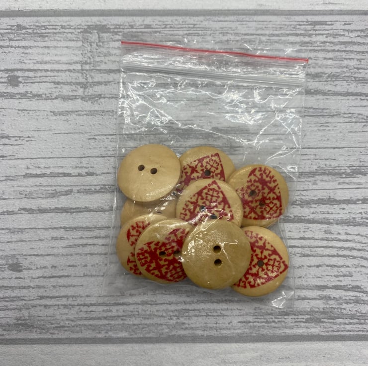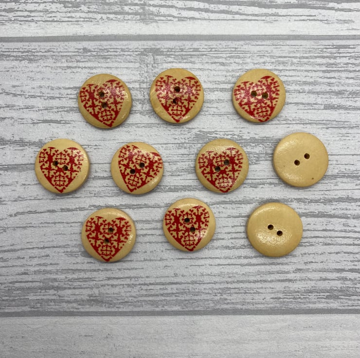 Pack of 10 wooden buttons in neutral wood shade with a red heart design.