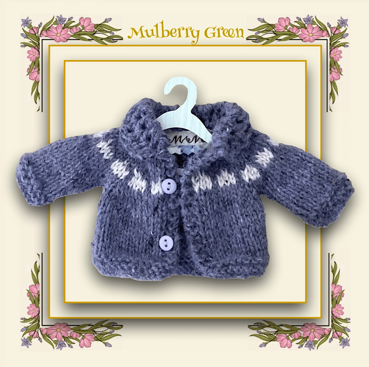 A really cute little collared cardigan in soft purple Felted tweed to fit the Mulberry Green characters. The cardigan has a pattern on the yoke and looks lovely with the Anemone dress.
