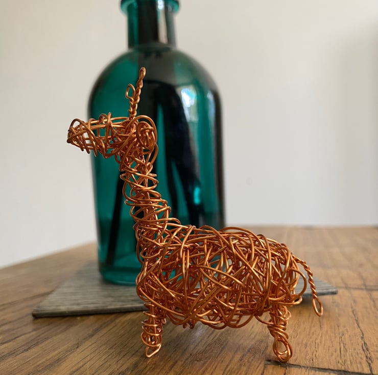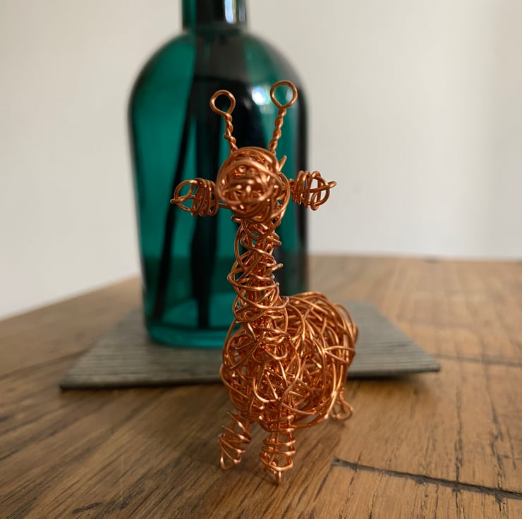 A small giraffe made using non tarnish copper wire. An idea little gift measuring approximately 1.5 of a inch & a little under 3 inches high